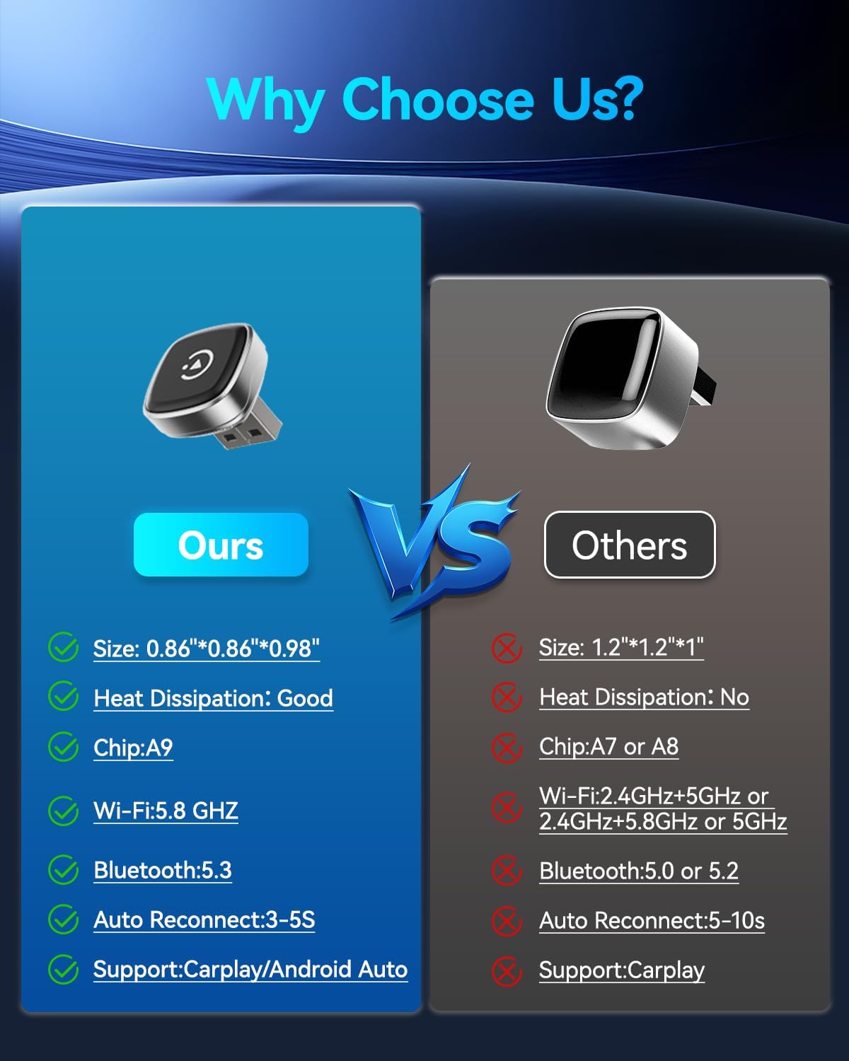 Ultra-Mini & Stable, Ultra-Low Lag – Wireless CarPlay adapter (0.86″ × 0.86″ × 0.98″) is over 65% smaller than other CarPlay adapters. Equipped with the latest A9 chip (2026 upgrade), it delivers more stable and smoother signal transmission (supports 5.8GHz Wi-Fi & Bluetooth 5.3). Enjoy lower latency, lossless sound quality, clearer images and smooth original car operation.