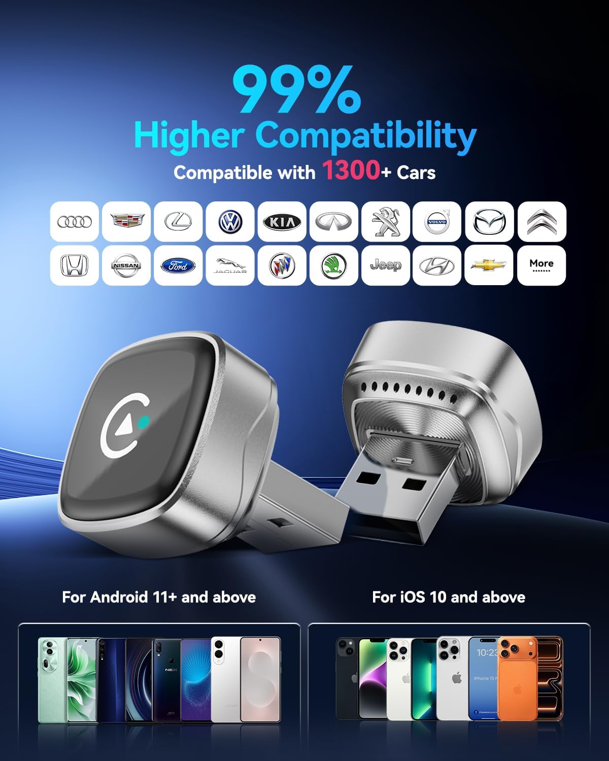 Wide Compatibility – Wireless CarPlay: iOS 10+; Wireless Android Auto: Android 10+. Bluetooth CarPlay adapter compatible with 99% of vehicles pre-equipped with usb wired CarPlay (Not compatible with Tesla or BMW).