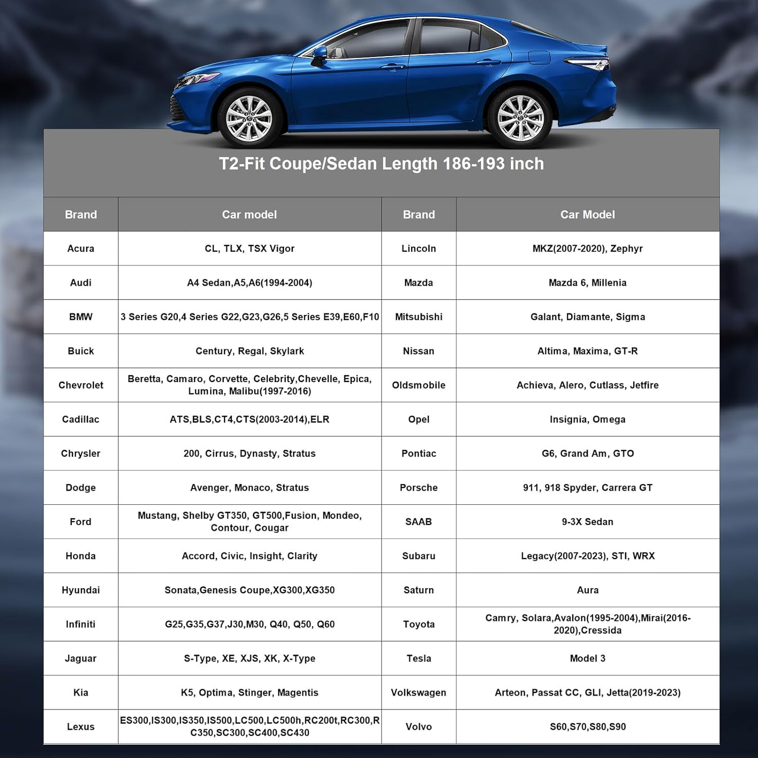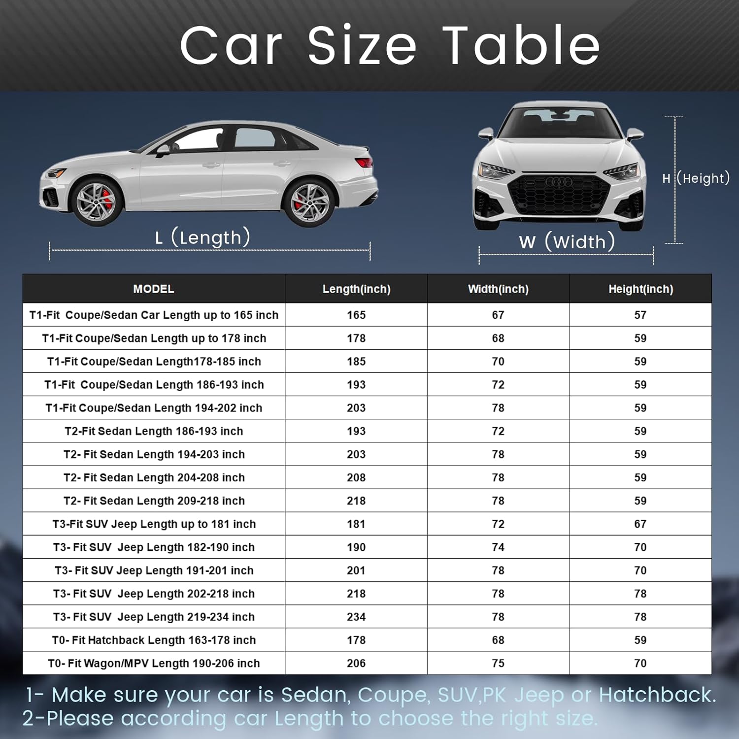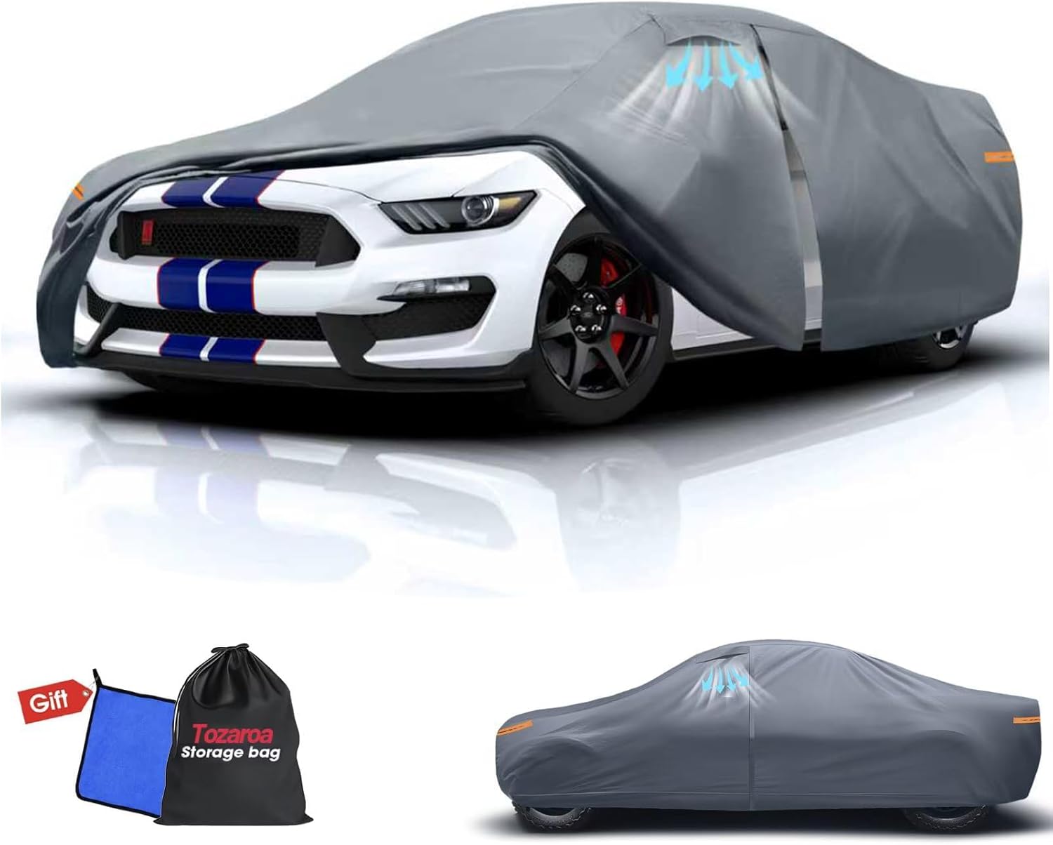 【Model Choice】Tozaroa automobiles cover is suitable for Coupe, Convertible, Length 186 to 193 inch (Not for SUV Hatchback). For exmaple–Chevrolet Chevy Camaro/Corvette, Ford Mustang/Shelby/Thunderbird, Toyota Camry, Honda Accord, Kia Optima, BMW 5 Series 525i, Cadillac Eldorado, Jaguar XJS/XK-Series, Mercedes-Benz C-Class/E-Class/SL-Class/SLS-Class, Lexus LC-Series/SC-Series, Bentley Continental, Mitsubishi 3000GT etc.