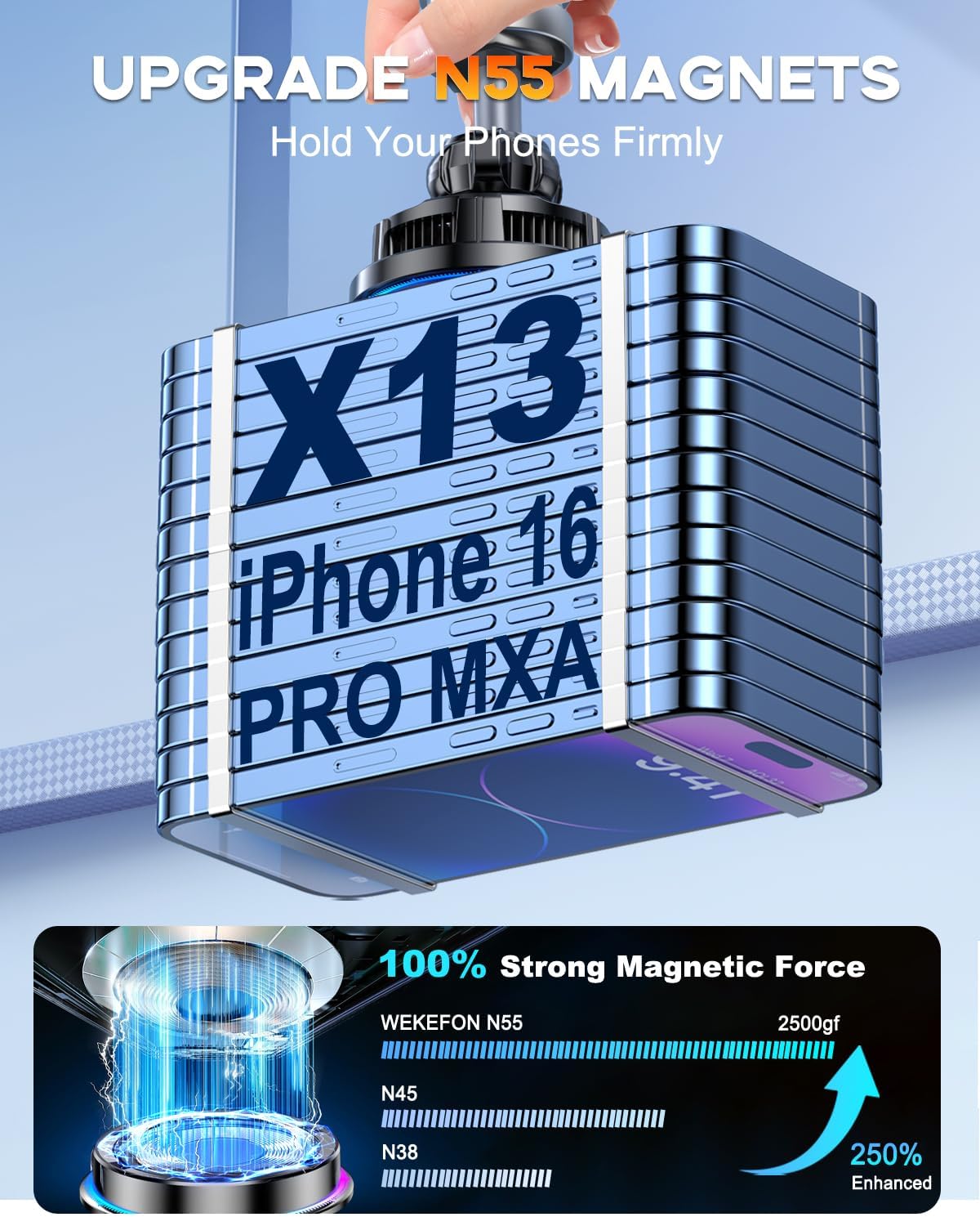 【Upgraded to Ultra-Strong N55 Magnets】 Our magnetic car phone holder wireless car charging upgraded to N55 magnets, with 2500g holding, 250% stronger than the standard in the market, Your phone stays securely to the charger even on bumpy roads. This car charging holder for magsafe mount is a top choice for keeping your phone charged and safe while driving