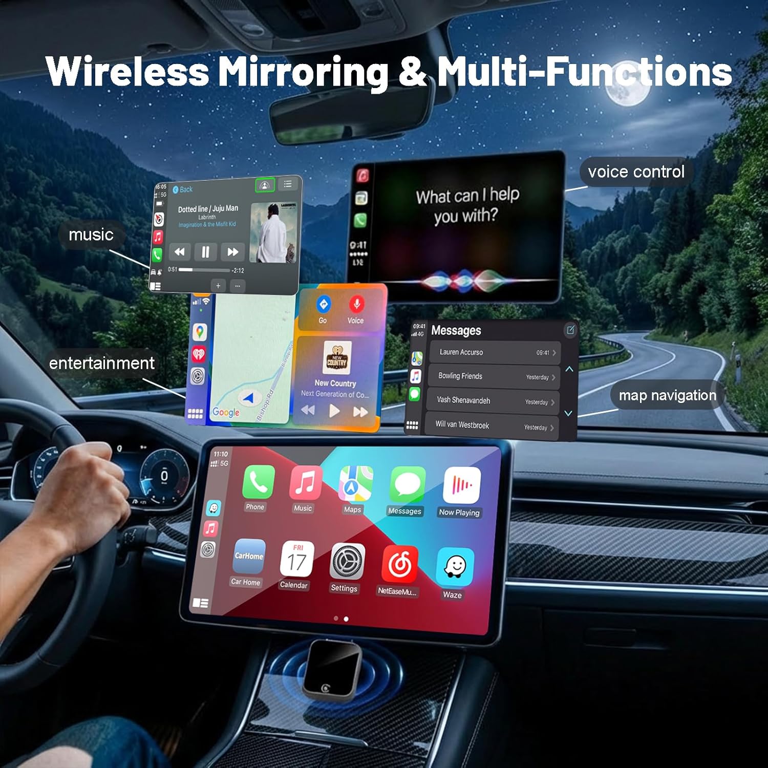 [Wireless Mirroring & Multi-Functions]: Supports wireless mirror link with voice control, map navigation, music & entertainment via the screen mirroring adapter for car; Ultra-compact size eliminates messy charging cables and tidies up your car interior perfectly, ideal for seamless wireless CarPlay use.