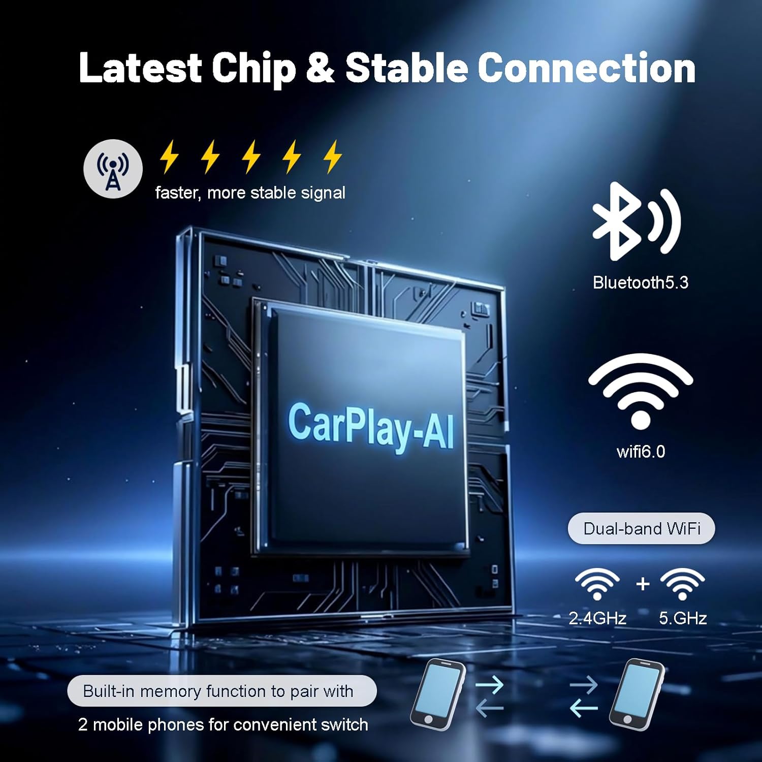 [Latest Chip & Stable Connection]: Equipped with advanced chip supporting Bluetooth CarPlay, Bluetooth 5.3 & WiFi 6.0; Dual-band WiFi (2.4GHz + 5GHz) for faster, more stable signal; Built-in memory function to pair with 2 mobile phones for convenient switch, keeping your wireless CarPlay connection non-interrupted.
