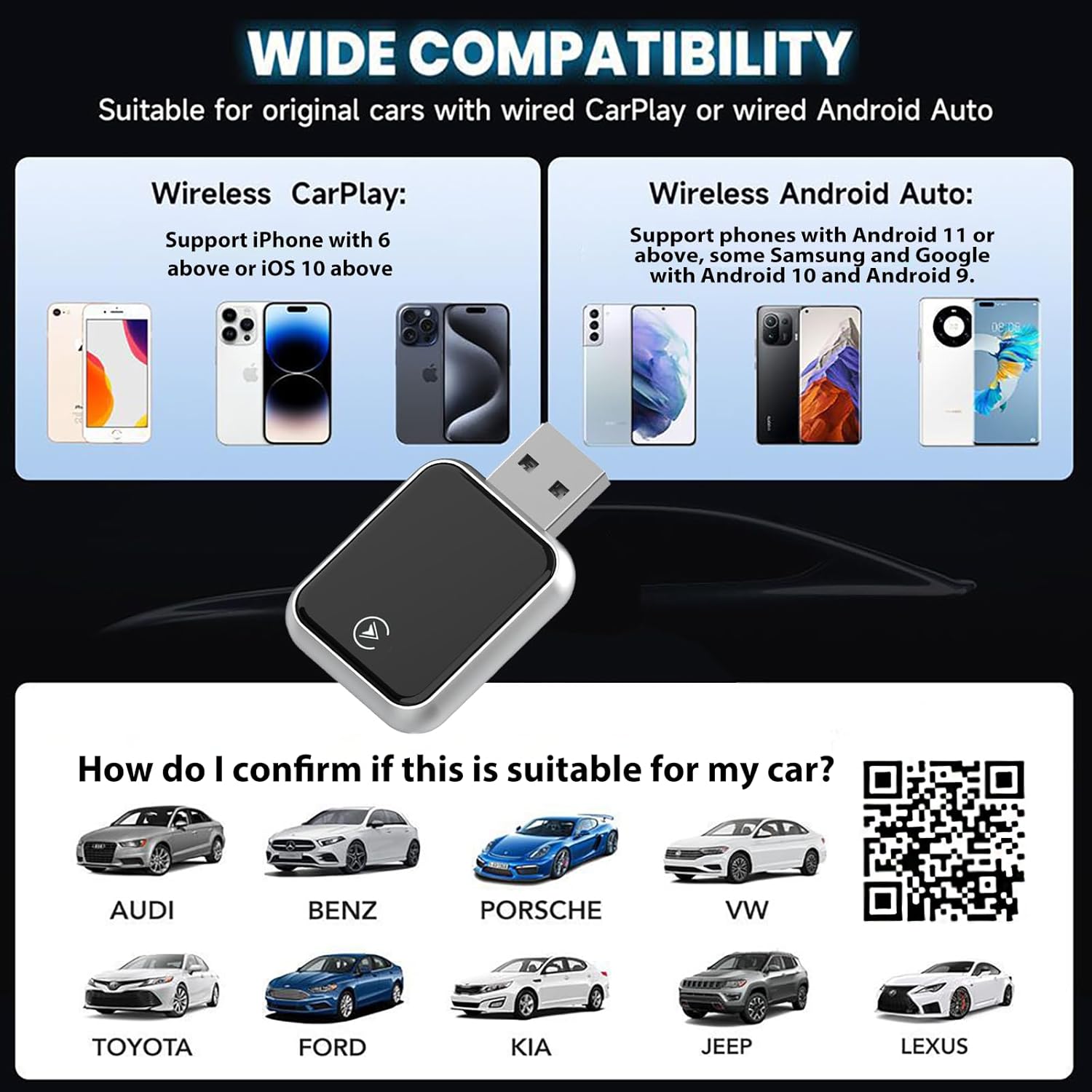 [Wide Compatibility for Phones & Vehicles]: Works with iOS 10+ (iPhone 6 and above) & Android 11.0+ smartphones. Compatible with 98% of 2016 and newer cars with factory wired CarPlay built-in.