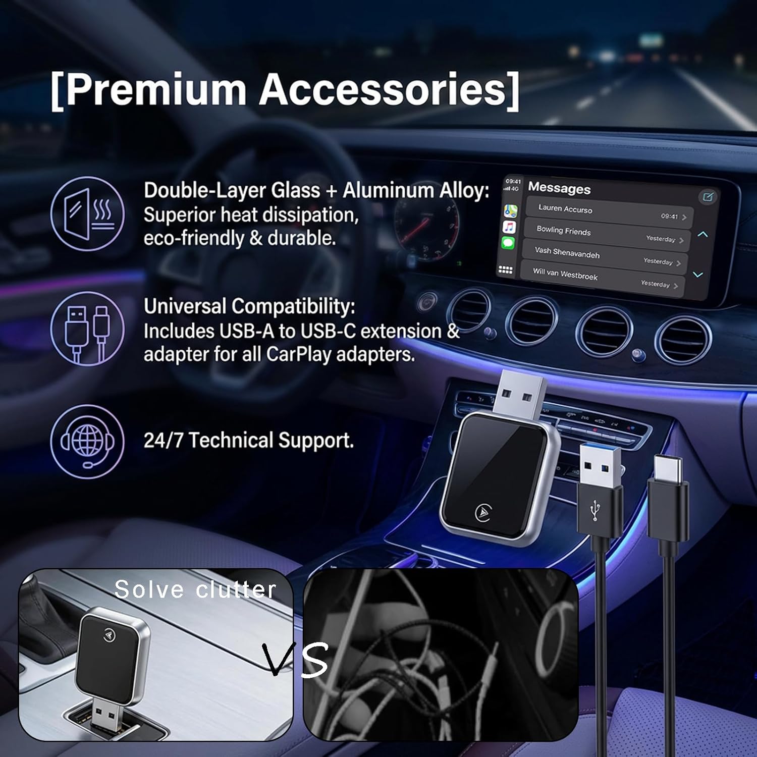 [Premium Accessories]: Crafted from double-layer glass panels + aluminum alloy for superior heat dissipation, eco-friendly and durable for long-term use with your in-car CarPlay adapter. Includes a universal USB-A to USB-C extension cable and USB-C adapter compatible with all CarPlay adapter types. 24/7 technical support for peace of mind.
