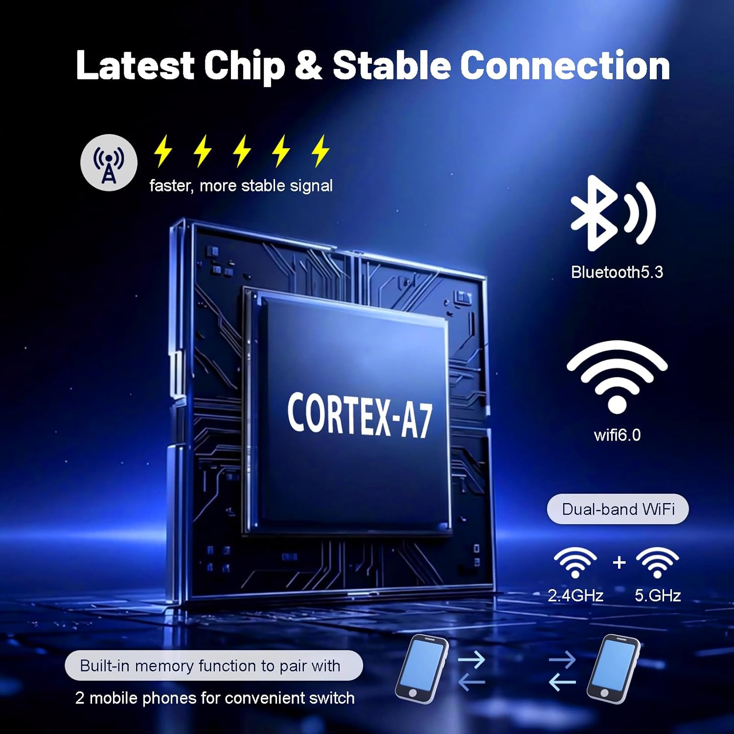 [Latest Chip & Stable Connection]: Equipped with advanced chip supporting Bluetooth CarPlay, Bluetooth 5.3 & WiFi 6.0; Dual-band WiFi (2.4GHz + 5GHz) for faster, more stable signal; Built-in memory function to pair with 2 mobile phones for convenient switch, keeping your wireless CarPlay connection non-interrupted.