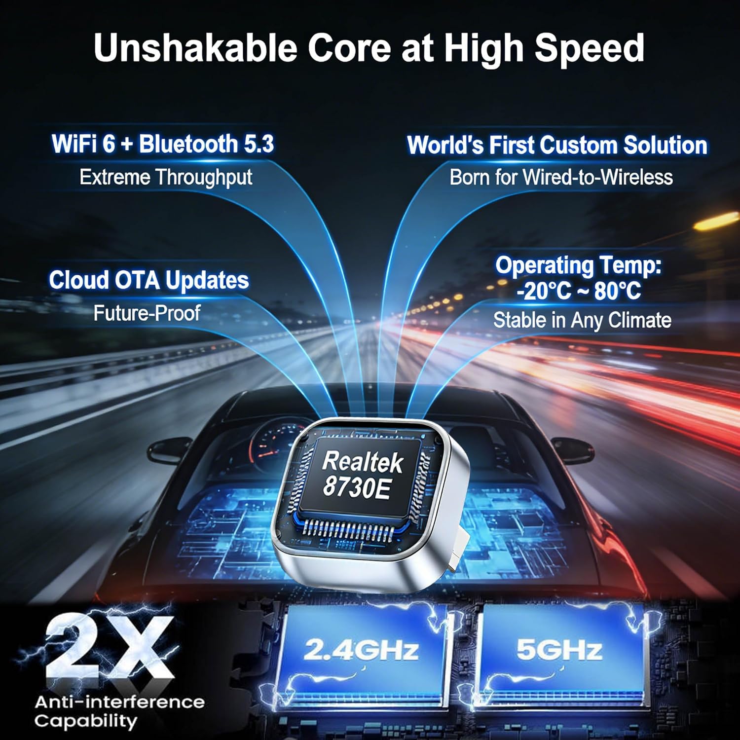 【Realtek 8730E Advanced Core】Its heart is the Realtek 8730E, the first specialized chip designed solely for wired-to-wireless conversion. Paired with WiFi 6 and Bluetooth 5.3, this powerhouse delivers a rock-solid, lag-free connection—so your audio, maps, and calls stay perfectly in sync.
