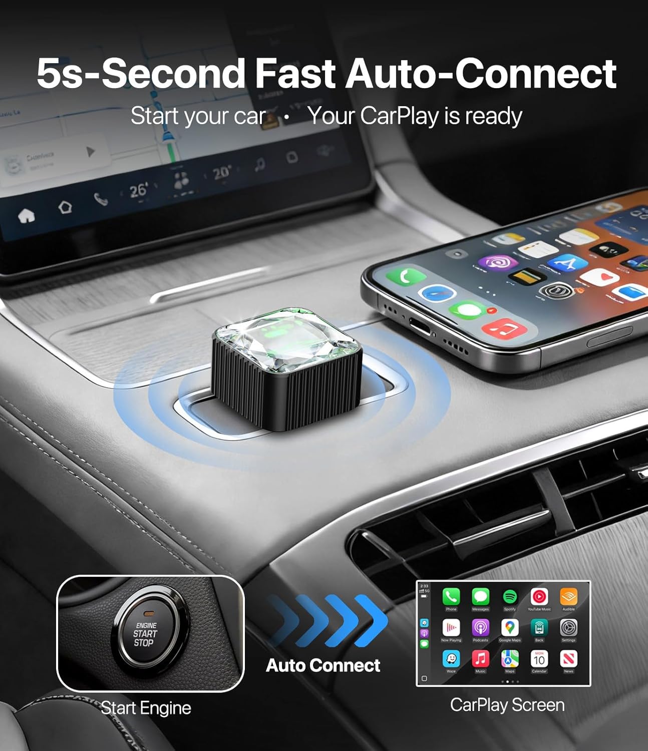 5-Second Fast Auto-Connect & Seamless Experience – Enjoy wireless Apple CarPlay in as fast as 5 seconds. Once paired, your iPhone automatically reconnects every time you start the car. Experience smooth navigation, calls, music and messaging with low latency and stable performance.