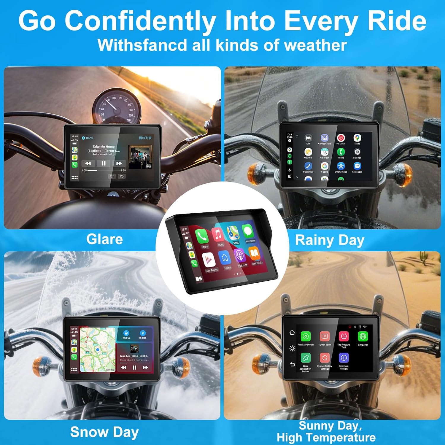 【IP69K Waterproof CarPlay Screen】 This 5-inch CarPlay screen features an IP69K waterproof rating, ensuring stable sound transmission and device connectivity even in rainy or snowy weather. The high-quality YZW CarPlay is suitable for various scenarios, Including beach ATVs, snowmobiles, rally motorcycles, personal watercraft (PWCs) and street motorcycles, without compromising the user experience.