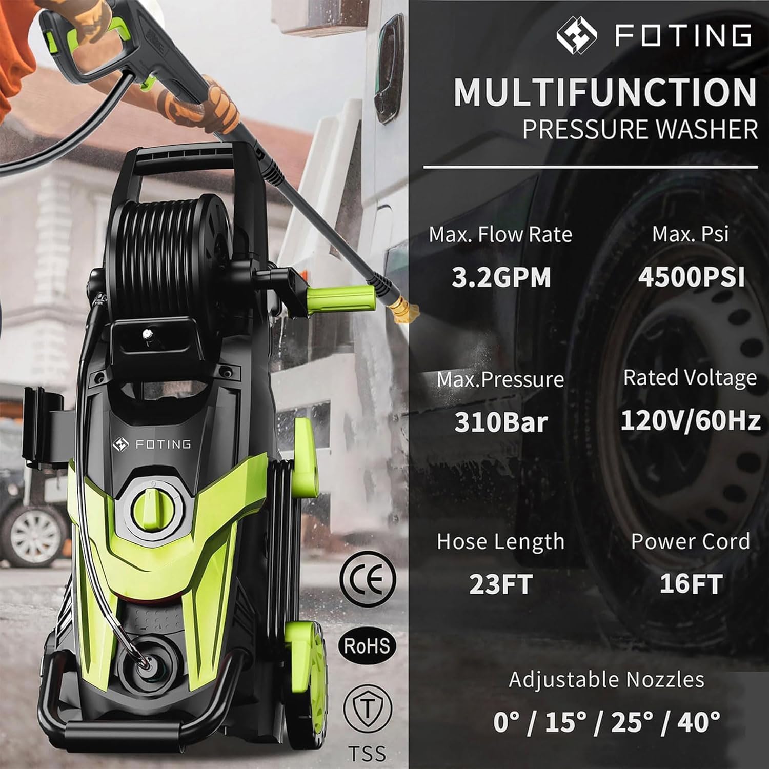 Powerful & Efficient Cleaning: Achieve 4500PSI/3.2 GPM for deep cleaning cars, driveways, decks, siding, and outdoor equipment while saving water and energy. Tackle tough grime effortlessly