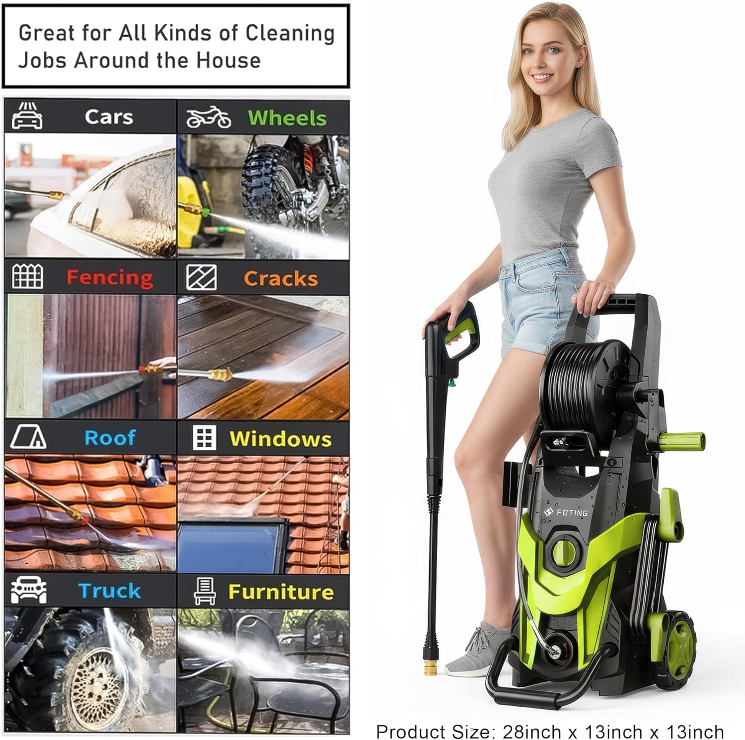 I ordered this electric pressure washer to tackle some DIY exterior wall cleaning, and it has exceeded my expectations with its excellent cleaning capabilities. It’s simple and easy to use, and I first tested it on my driveway, car, patio, and fence. It removed dust, dirt, and stains effortlessly.The 4 quick-connect nozzles make it versatile, allowing you to switch between light rinsing and deep cleaning tasks with ease. The foam cannon is especially useful for car washing, producing thick and even foam that helps loosen dirt without scratching the car’s surface.When I used it to clean my patio, I found the setup process straightforward. The machine is lightweight, making it easy to maneuver, and the long power cord and hose provide ample reach to clean larger areas without hassle.This pressure washer is not only a fantastic helper for home cleaning but also a must-have tool for professionals. It combines efficiency, flexibility, and ease of use, making it a reliable choice for a variety of cleaning needs.