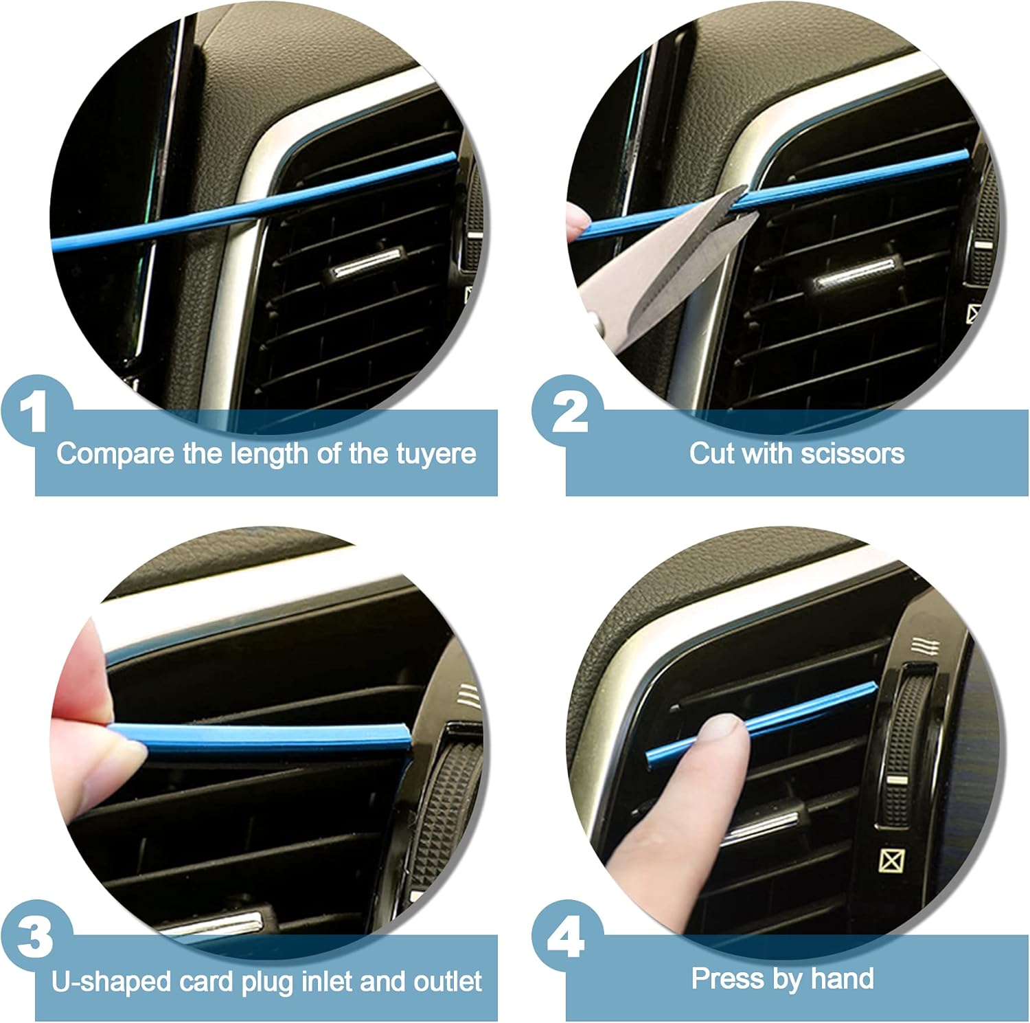 Easy to Use – Firstly measure the length of each grid of the air outlet and cut out the corresponding length then simply snap in the grid of the air outlet. Car trim interior strip has a U-shaped clip design, which can easily clamp the vent grille without falling.