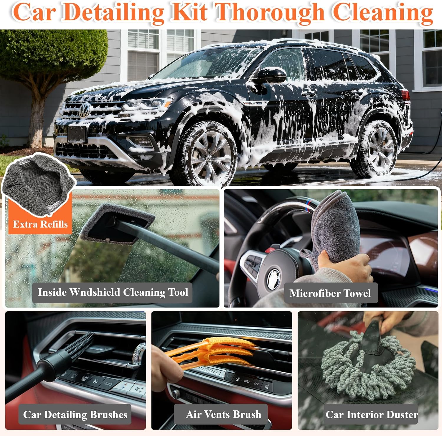 Complete Interior & Detailing Accessories – Use the car duster to sweep away surface dust from dashboards and consoles, then reach tight spots and air vents with the car detailing brush and air vent brush. Clean interior windshields and mirrors with the car windshield cleaner tool, and finish with soft wax applicator pads for a smooth, glossy shine. Store the entire car wash set neatly in the large organizer bag, perfect for home or on-the-go cleaning