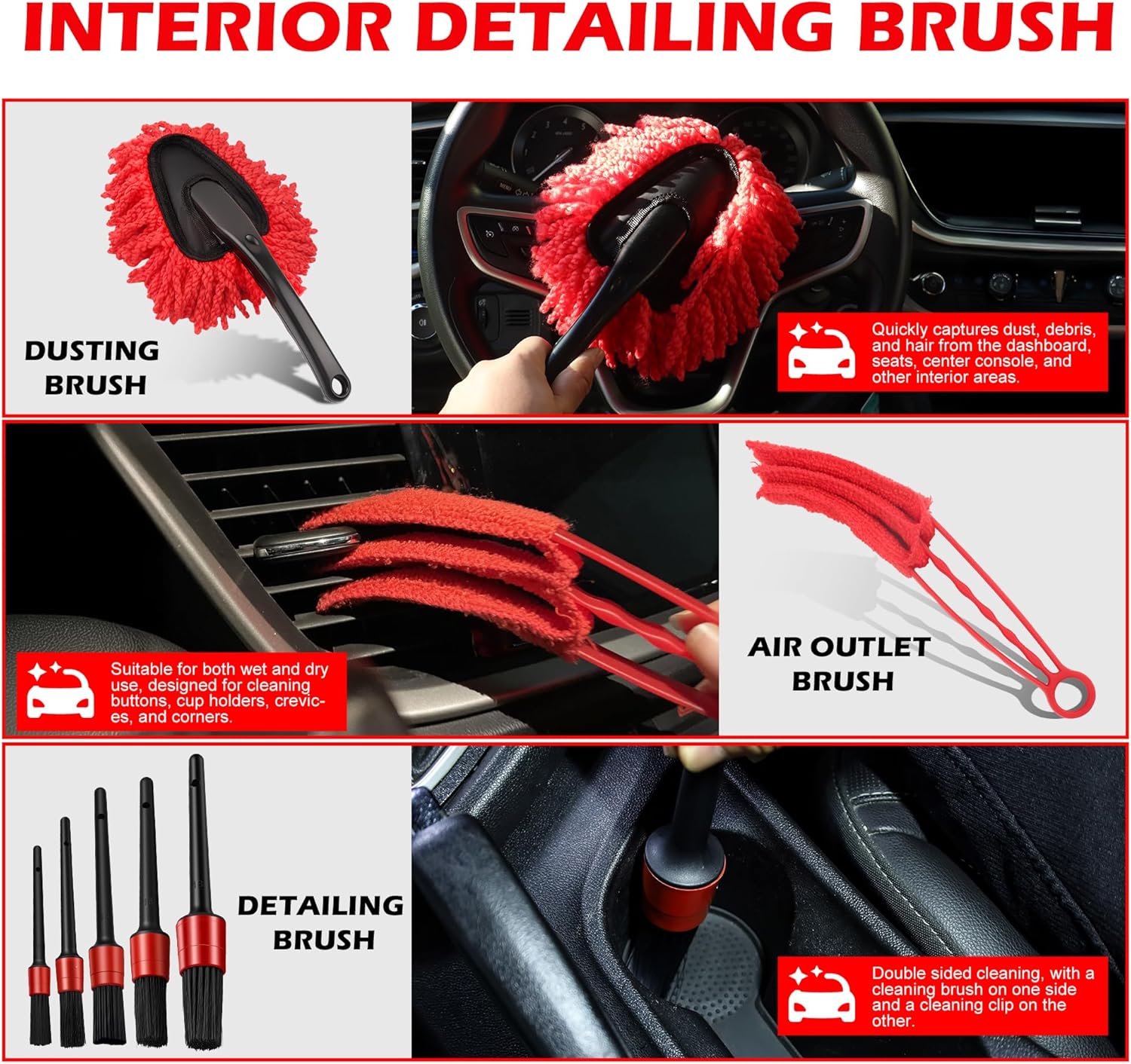 Interior Detail Tools: Soft dusting brush for dashboards/seats; Vented brush deep-cleans AC slots; 5-piece brush set targets buttons/cup holders/electronics. Perfect for delicate surfaces.