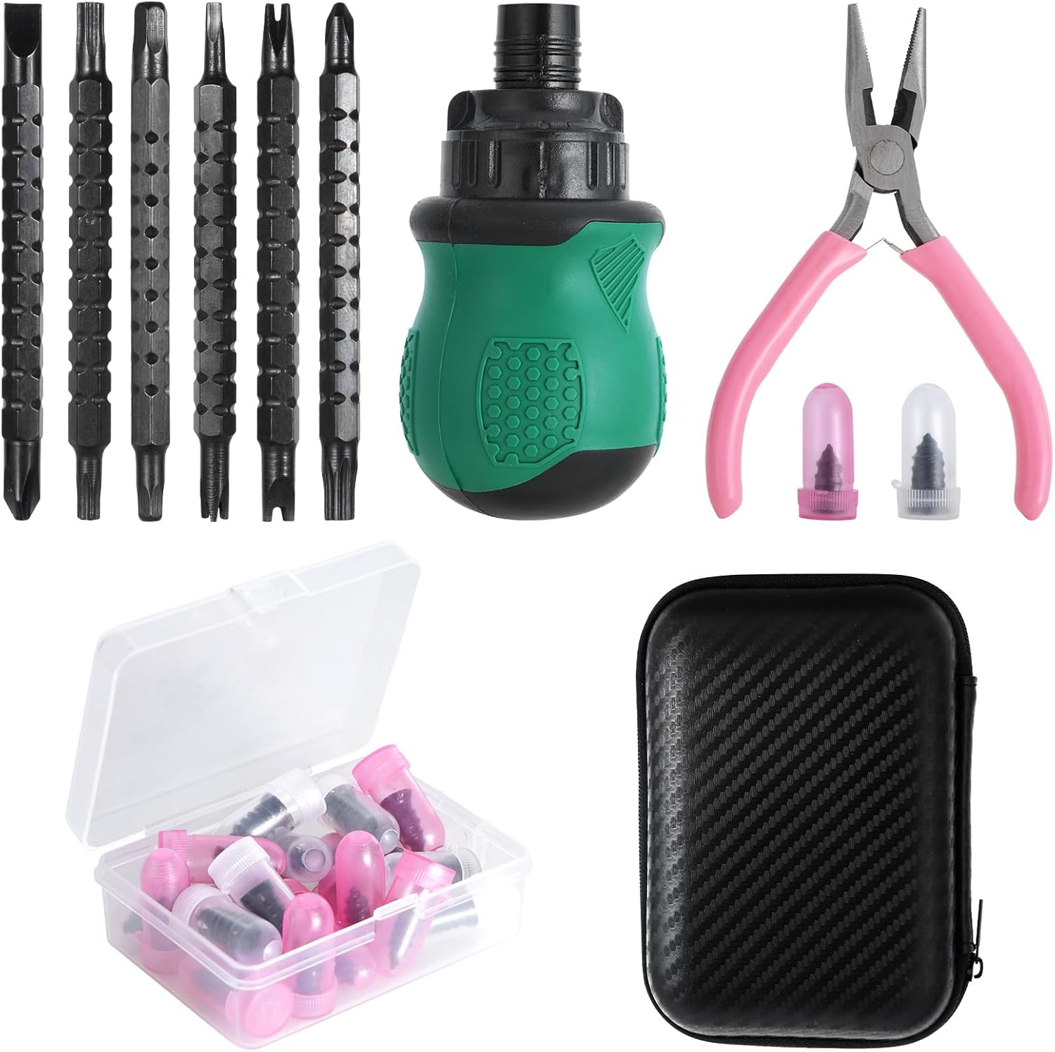 Before complaining about the ‘Green’ screwdriver just spinning around, how about using it?Insert one of the bit drivers into the handle, set the drive for left or right ratcheting or no ratcheting.The ‘Green’ handle works just fine.The pliers are fine, just open and close em a few times, maybe a drop of oil as well.The tire plugs appear to be fine. This kit is super small and will be a perfect fit for any car, truck, motorcycle, or bicycle.The case is sturdy and the cost is a great deal.I’ll purchase a kit for all my vehicles.