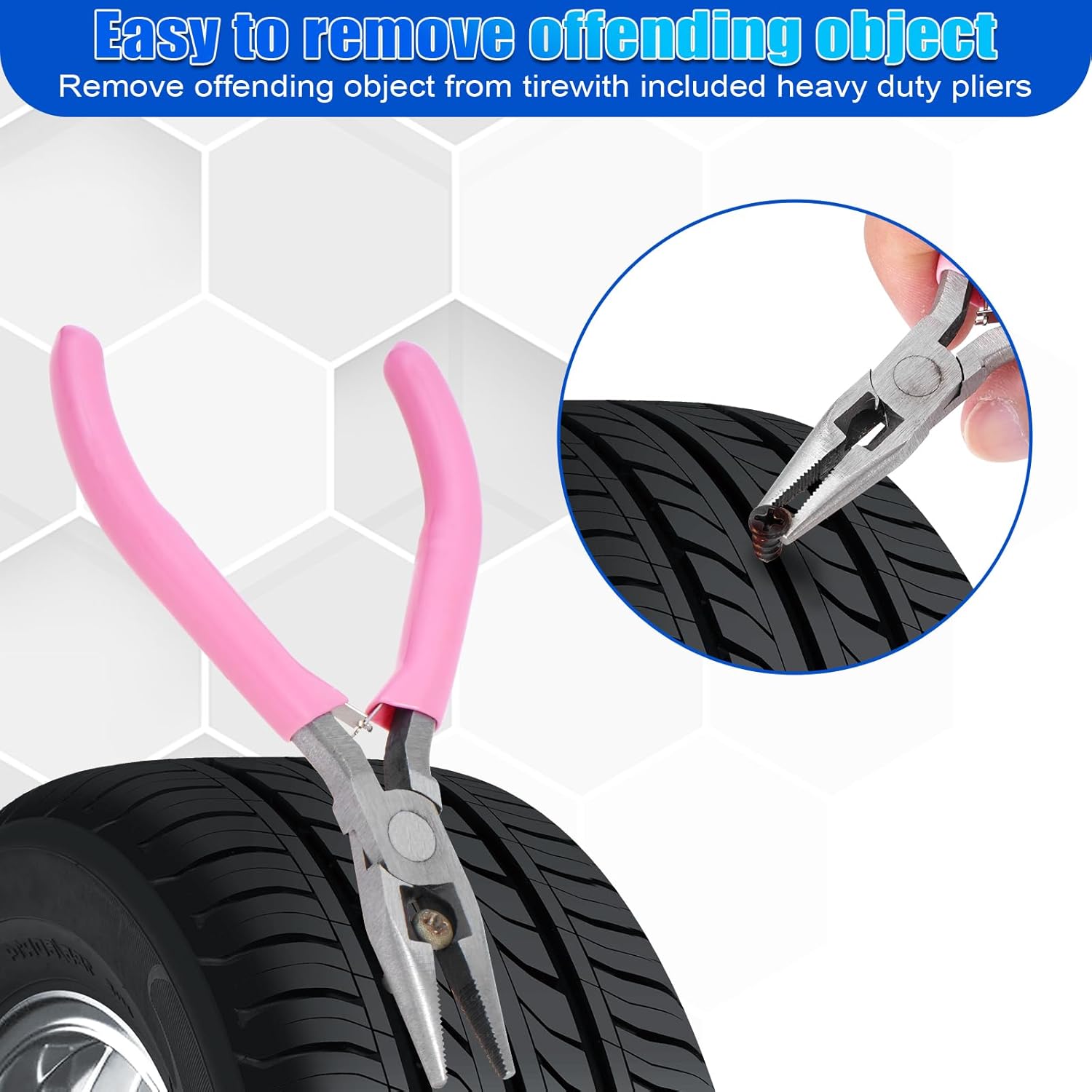 【You will receive】10 large self-tapping tire repair nails, 10 small self-tapping tire repair nails, 1 screwdriver handle, 6 screwdriver bits, and 1 needle-nose pliers, fully meeting your daily tire repair needs