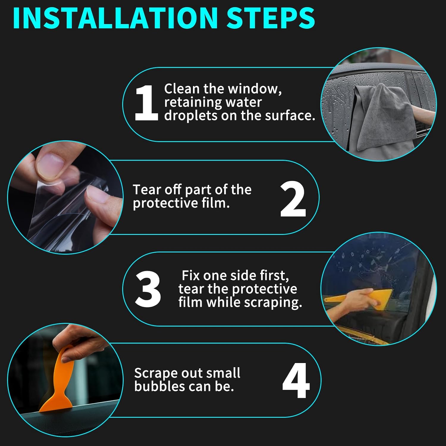 EASY TO INSTALL: 1. To clean the window, the surface to retain the water beads, easy to drive out the bubbles; 2. Tear part of the protective film; 3. First fixed side, while tearing the protective film while scraping, scraping the small bubbles can be