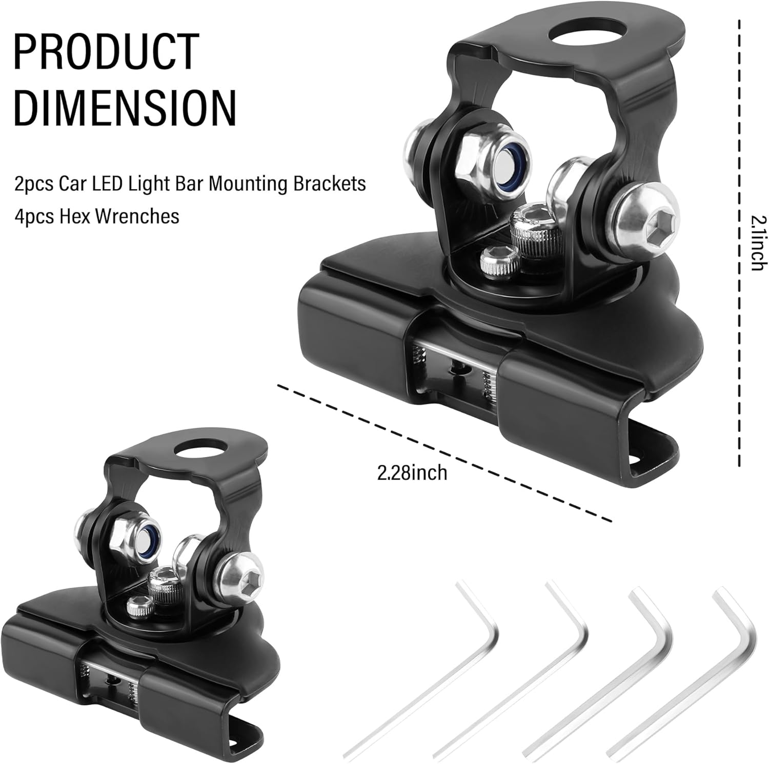 Size: Mounting Bracket: 2.28*2.10*1.46 inchHex Wrench: 2.00*0.72*0.10 inch/1.85*0.69*0.16 inchMaterial: Stainless SteelColor: Black / SilverPackaging: 2* Car LED Light Bar Mounting Brackets, 4* Hex Wrenches