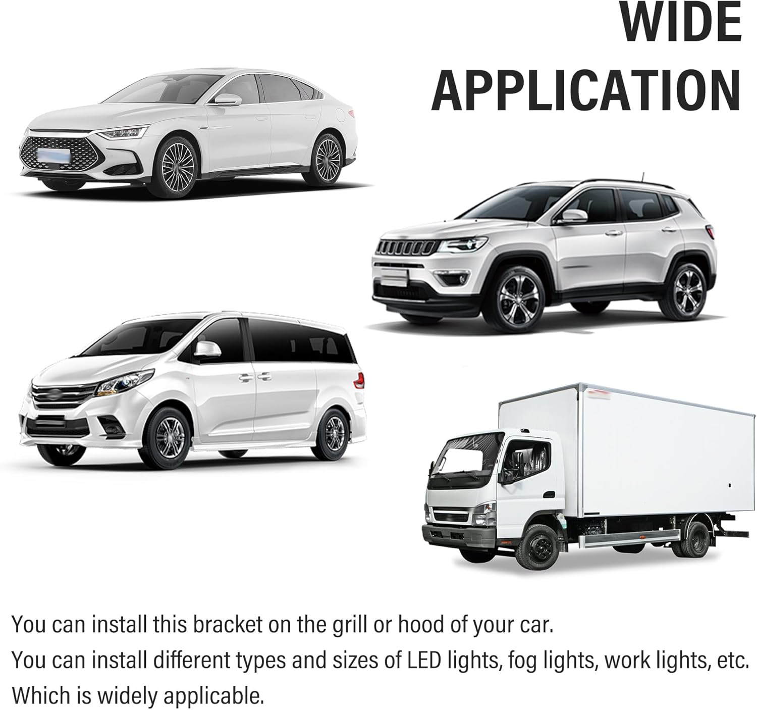 This car LED grill light bar brackets are suitable for most of the car models on the market, such as car, truck, SUV, van and so on.You can install this bracket on the grill or hood of your car.You can install different types and sizes of LED lights, fog lights, work lights, etc.