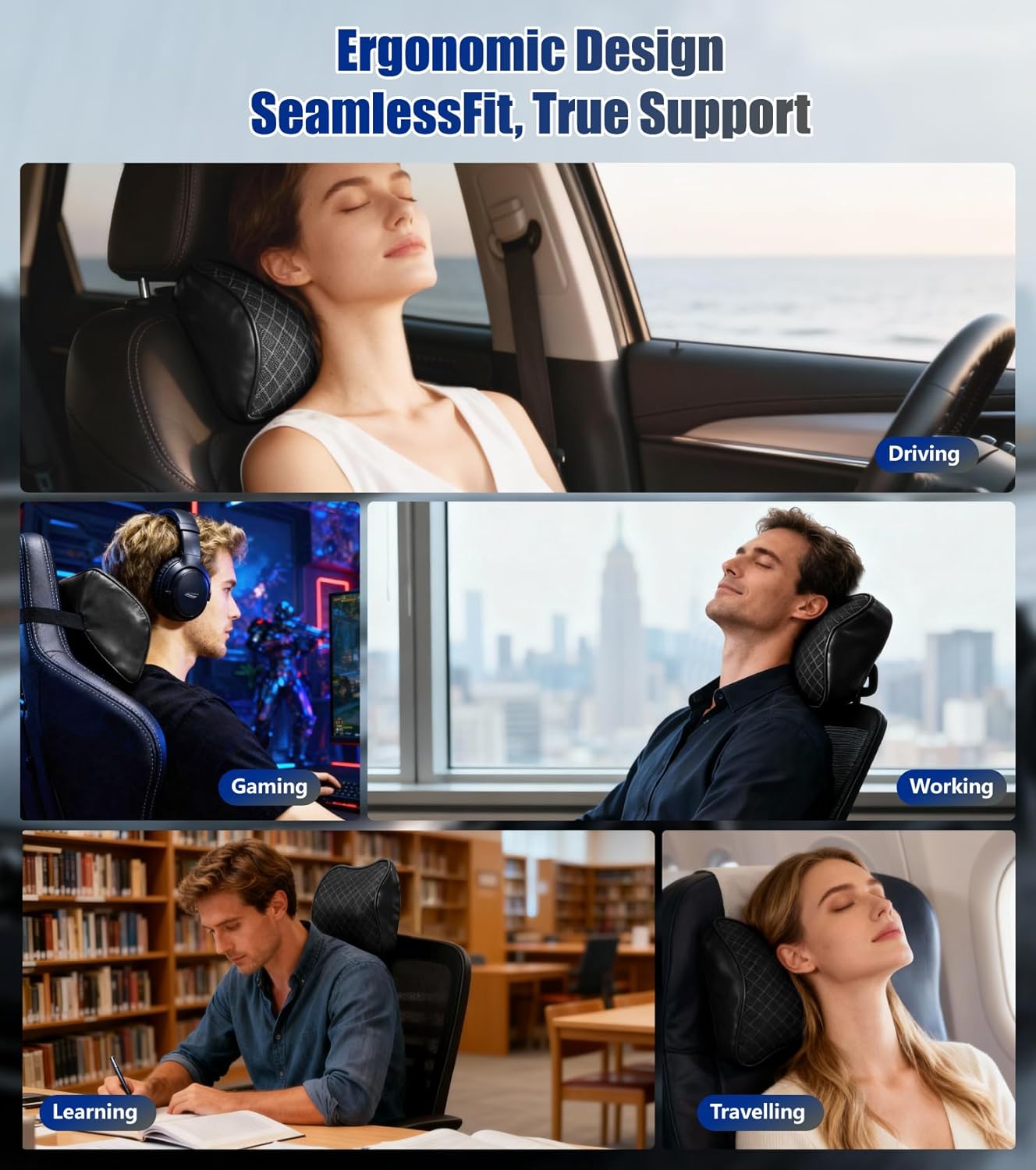 【GENUINE ERGONOMIC DESIGN】 Engineered with an ergonomic contour and wedge-shaped base, this car pillow headrest comfortably cradles your shoulders and neck for a seamless, gap-free fit, delivering exceptional driving comfort while significantly reducing neck pain and numbness during long trips or sleep for you and your family.