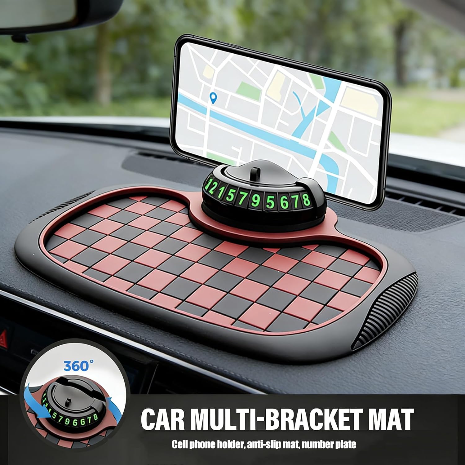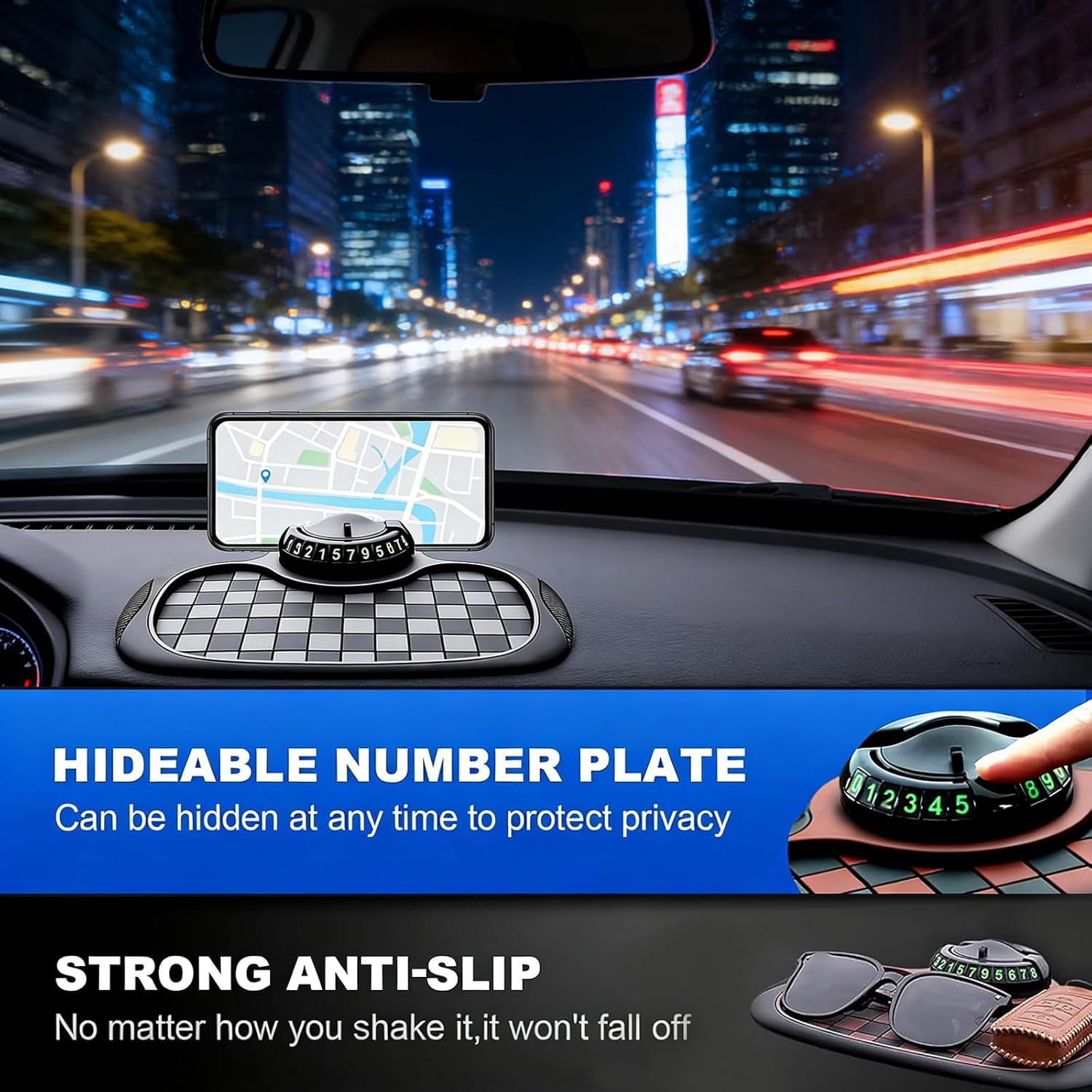 3-in-1 Multifunction: Combines anti-slip mat, phone holder and parking number plate in one, saves space and meets multiple car interior needs. Stable & Anti-Slip: High-friction surface prevents items from moving, ensures safe driving without distractions from falling objects. Flexible Viewing Angle: 360° rotation allows free adjustment for best navigation view, compatible with most mobile phones. Practical Parking Design: Reusable number cards offer convenient contact display, easy to flip and hide when unused. Washable & Long-Lasting: Waterproof and washable material can be cleaned repeatedly, durable for long-term use in any car.