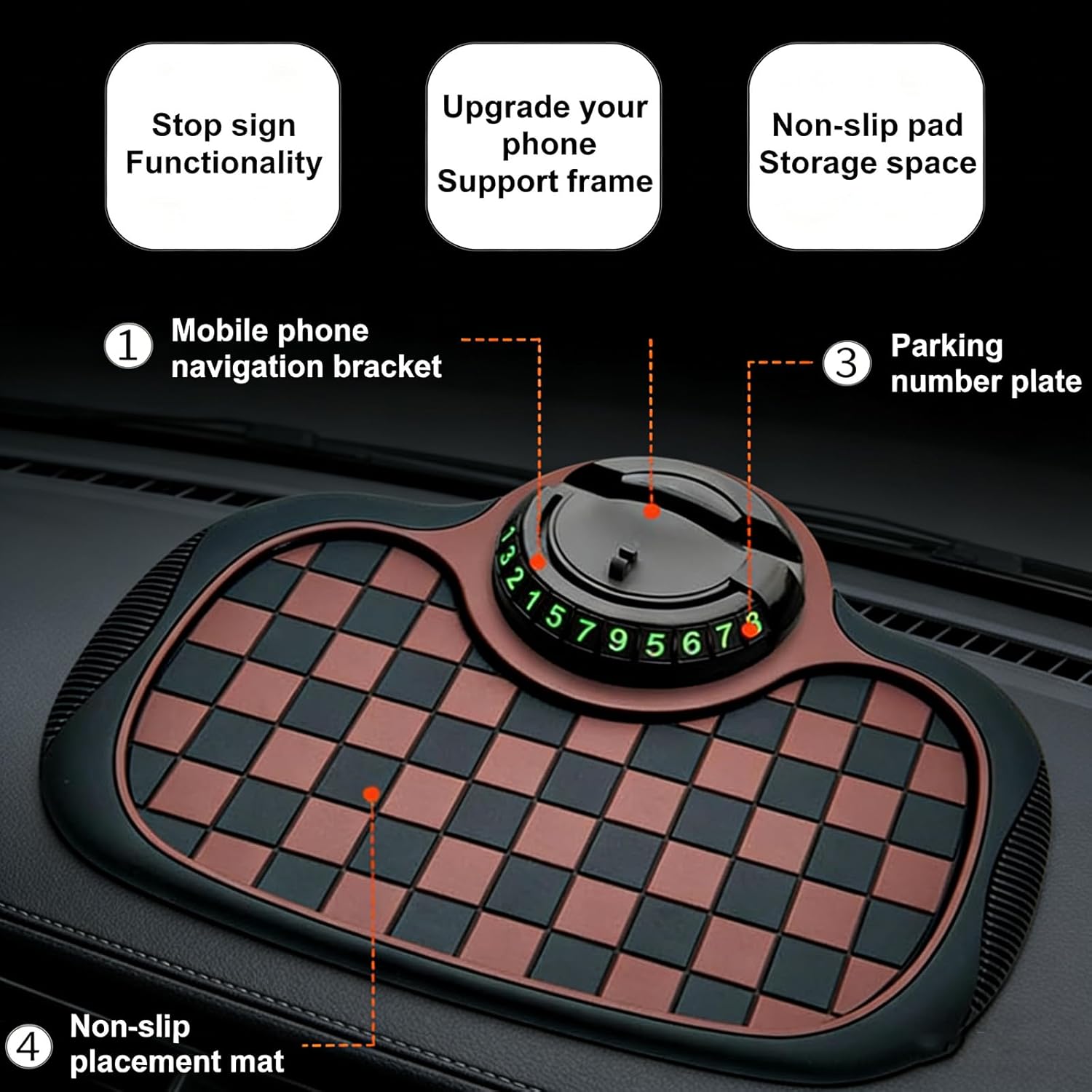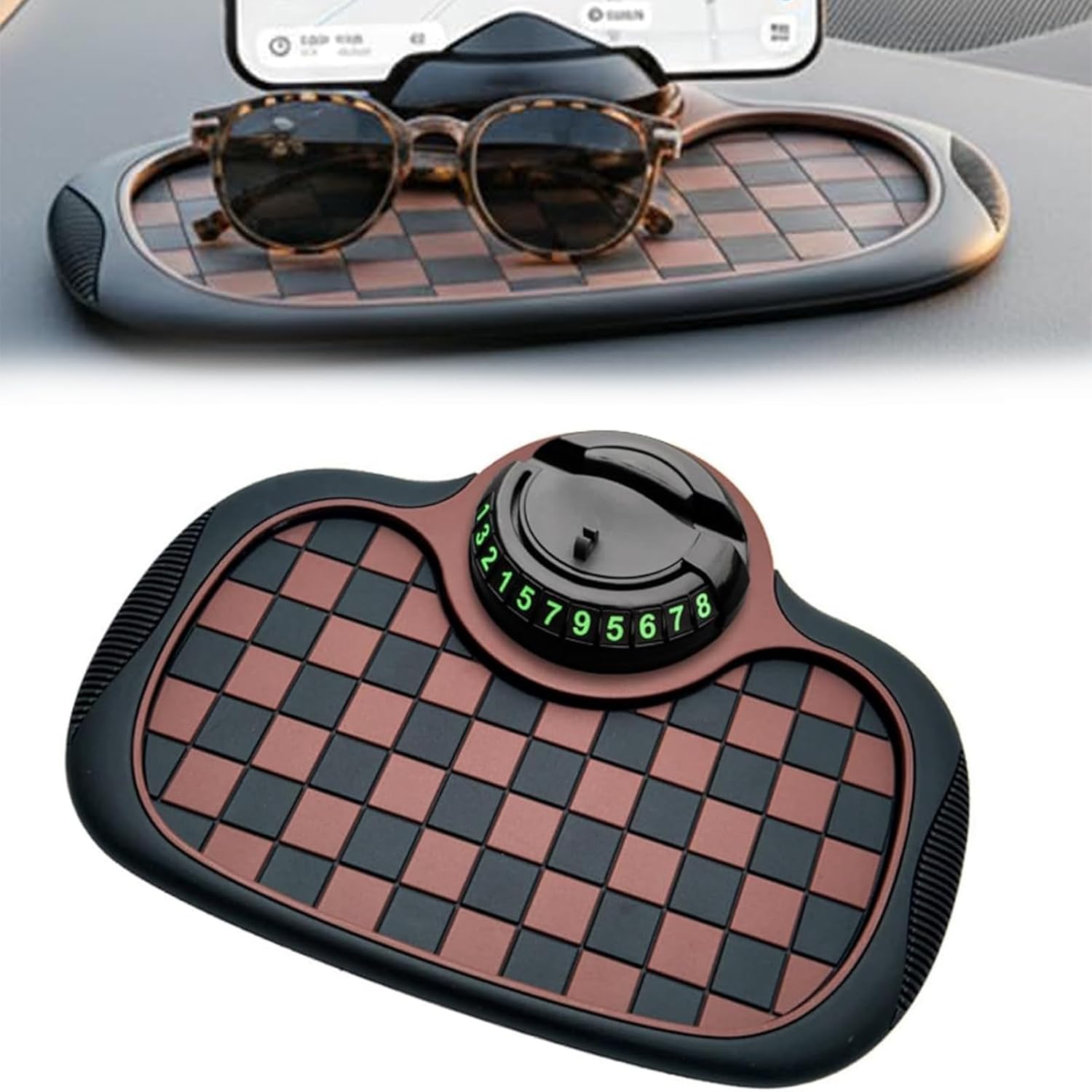 Multifunctional car anti-slip mat (brown-1PC) with 360° rotatable phone holder and temporary parking number. Non-slip surface, storage slots, easy to place, universal for all vehicles Product Highlights:360° Rotatable Phone Holder | Temporary Parking Number | Non-Slip Dashboard Mat | Universal Fit for Car/SUV | Washable & Reusable