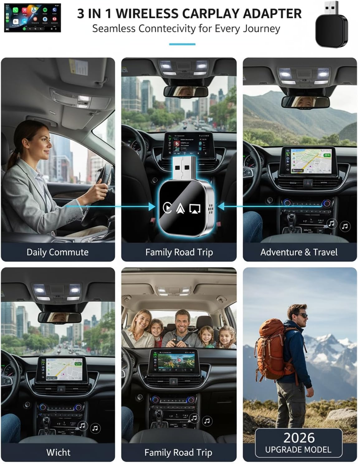 3-in-1 Wireless Integration: This versatile adapter supports wireless CarPlay, AirPlay. Easily connect your phone to your car’s screen without the hassle of wires, enabling seamless access to navigation, music, and apps