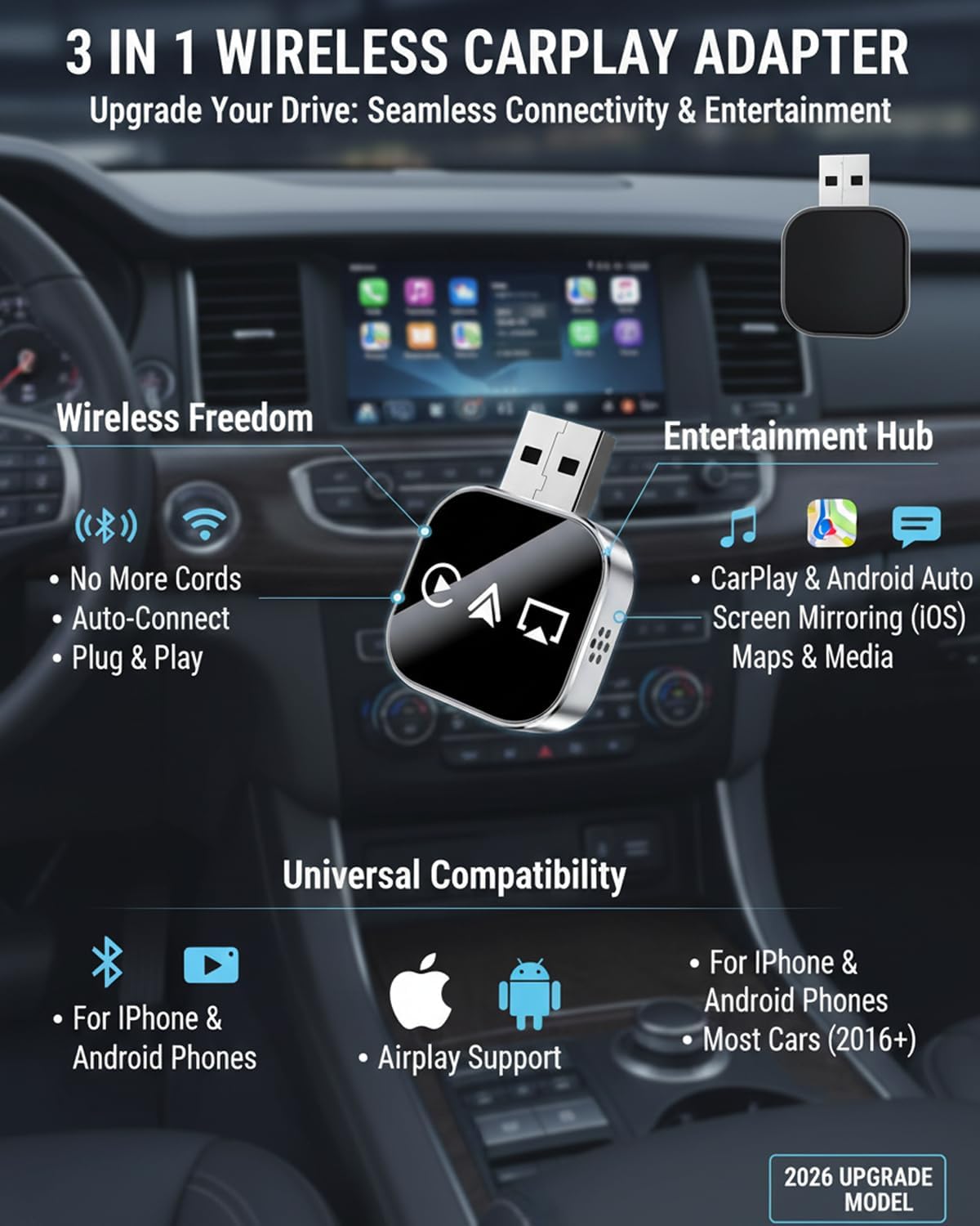 3 in 1 Wireless Carplay Adapter, Car Screen Mirroring Converter, 2026 Upgrade Mirror iOS Phone for iPhone/Airplay/Apple/Android, Bluetooth Auto Link, Wired to Wireless, Plug & Play (for iPhone)