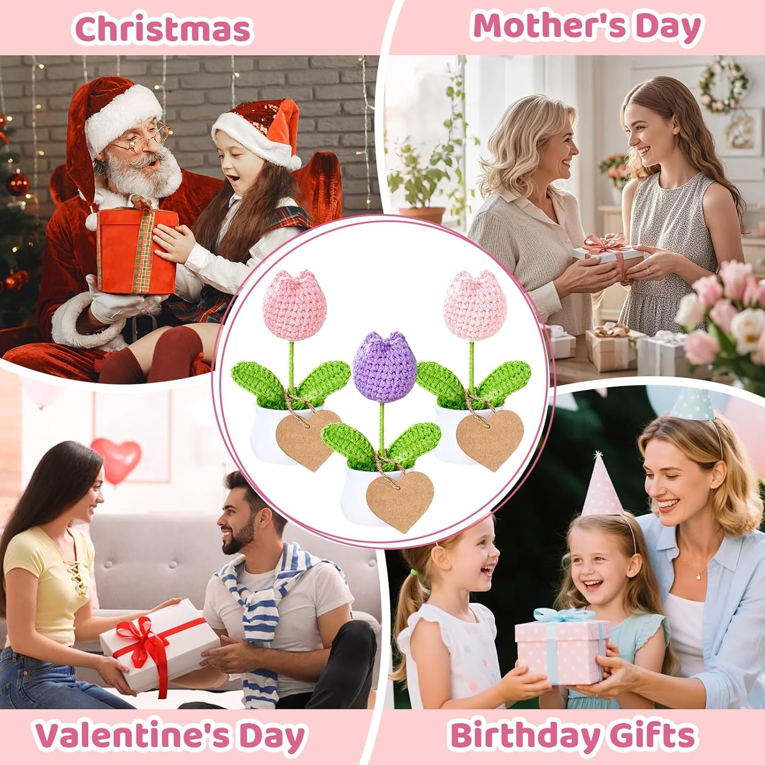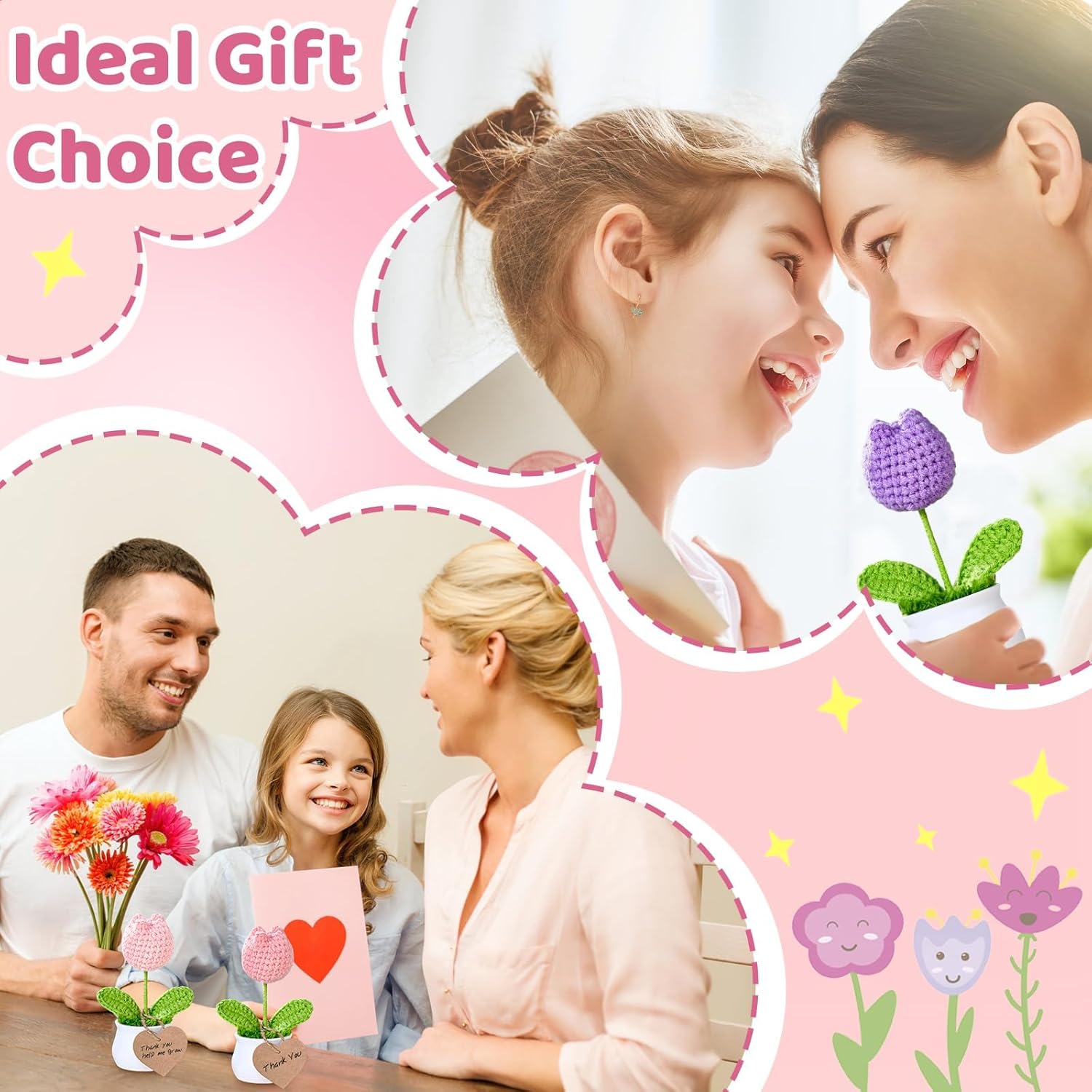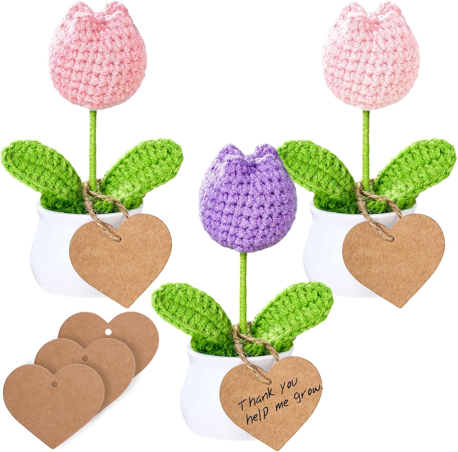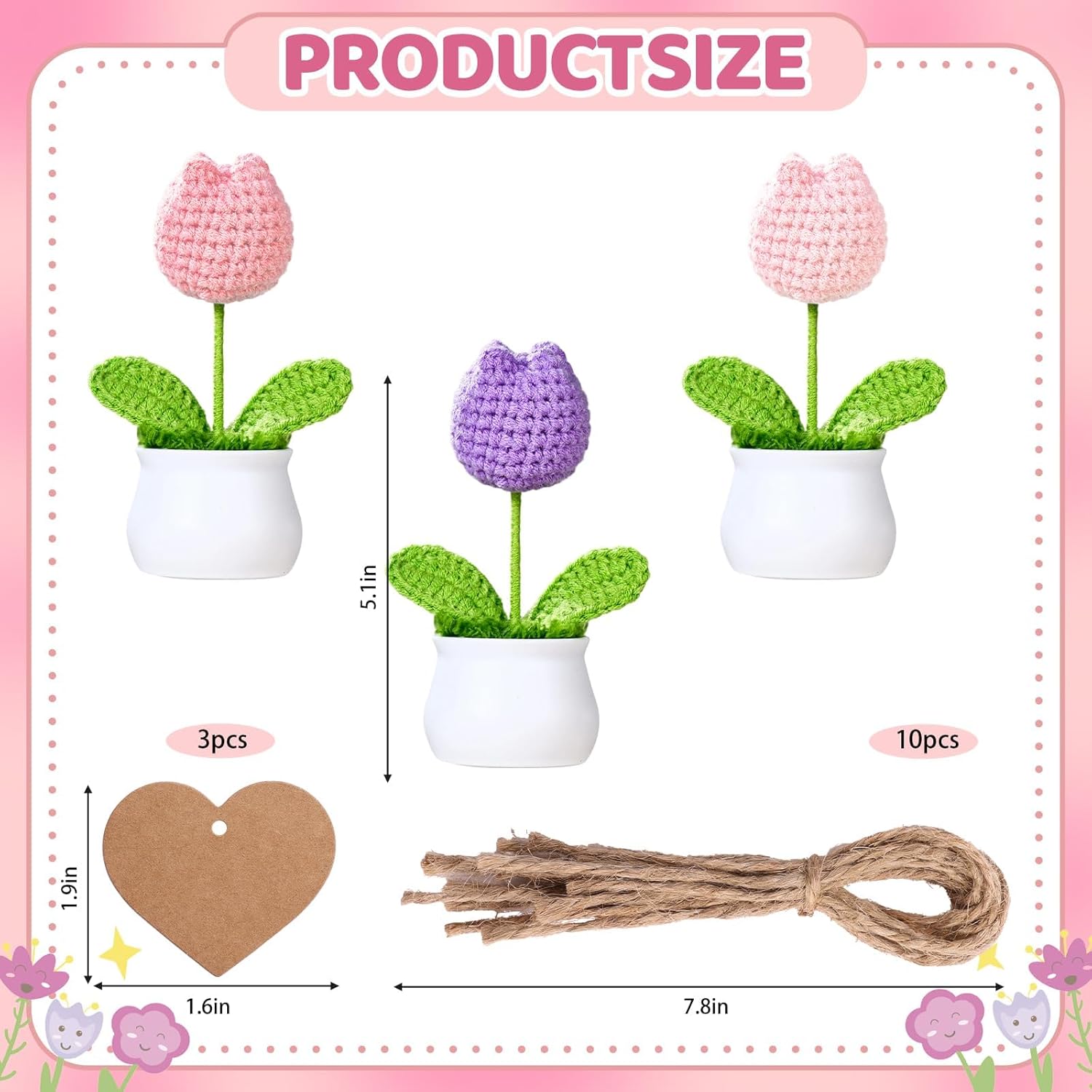 Complete Gift Ready Set:Includes 3 charming crochet flower pots, 3 heart-shaped paper cards, and 1 rustic jute twine for tying. Ideal as a crochet flower bouquet or plush bouquet for birthdays, Mother’s Day, or teacher’s Day,Valentine gifts