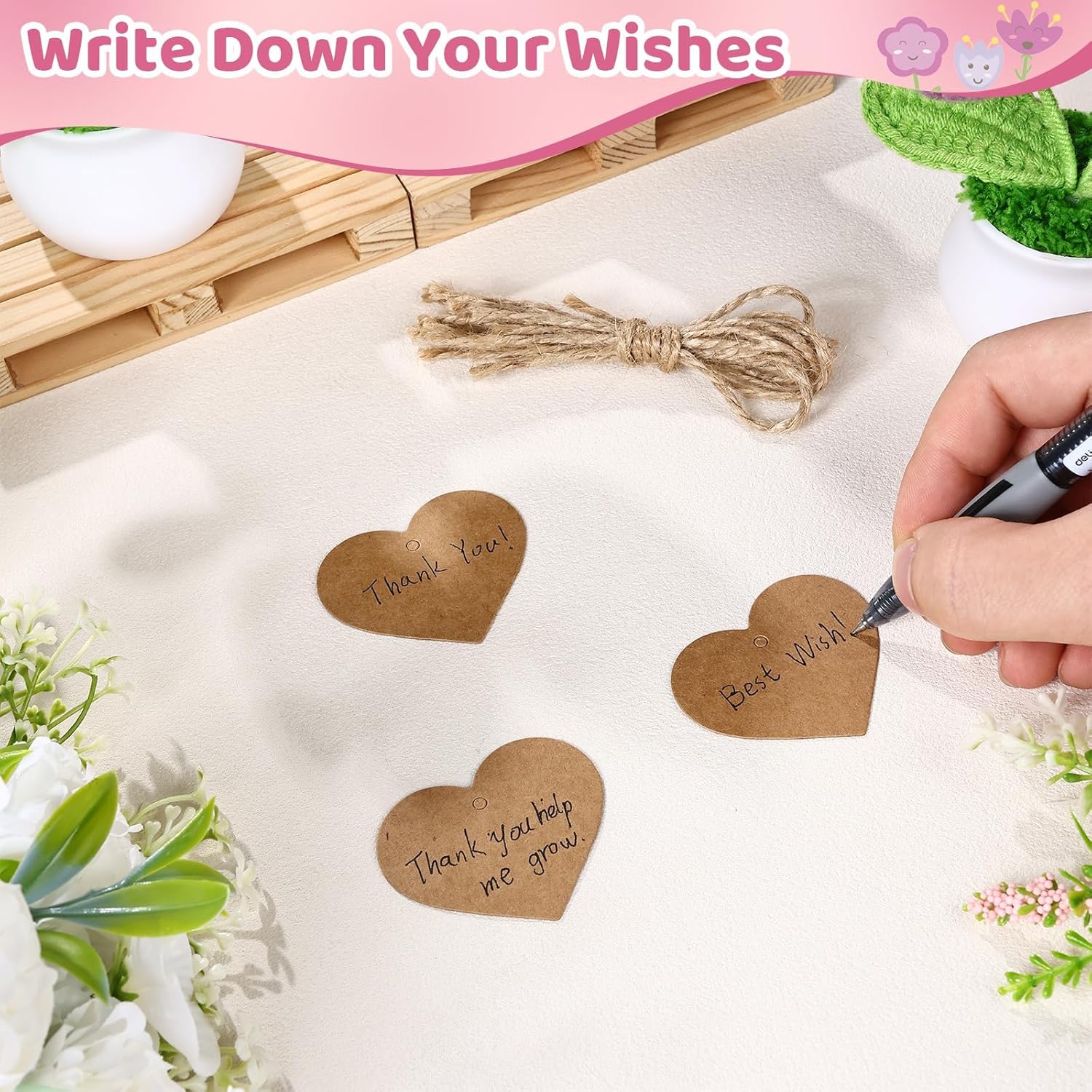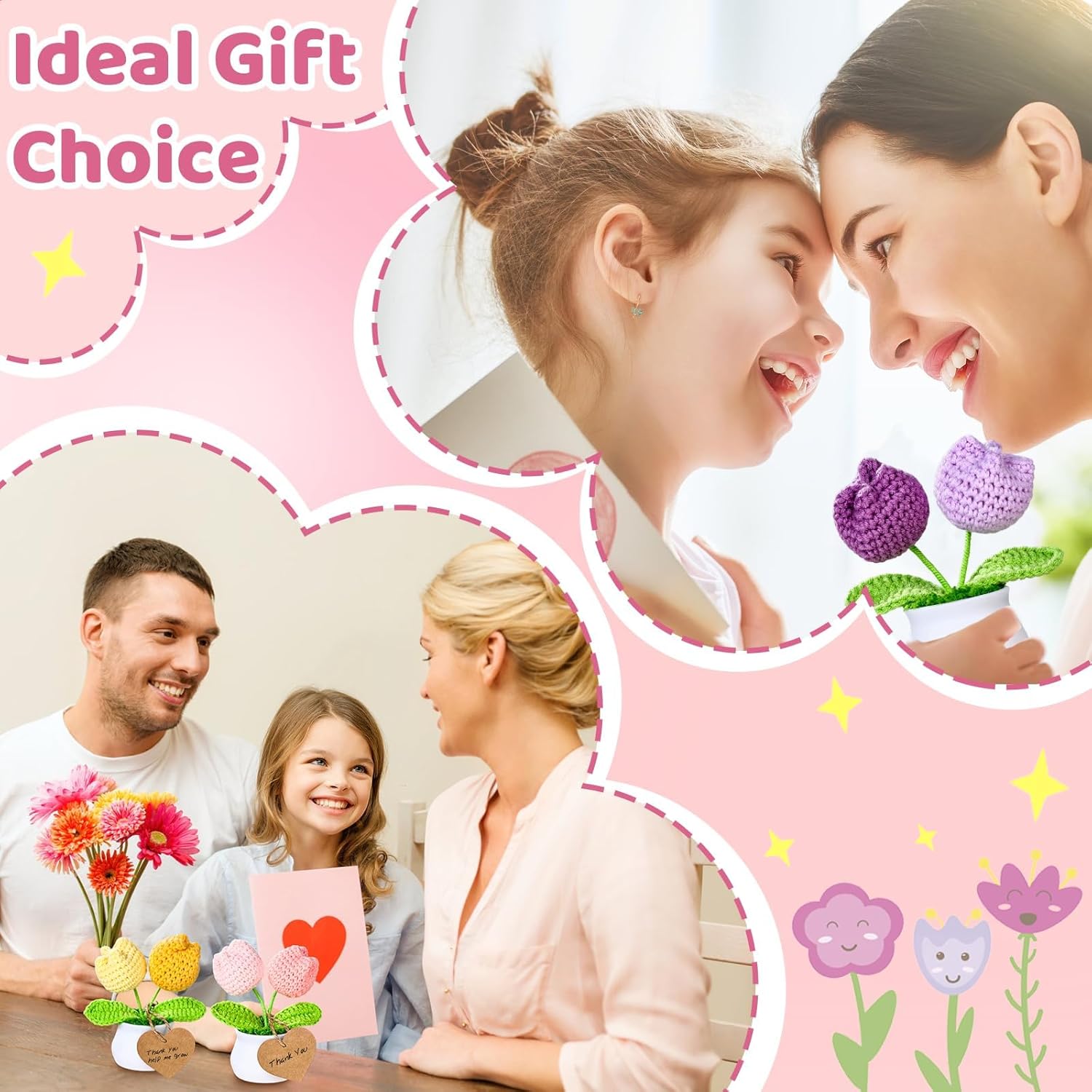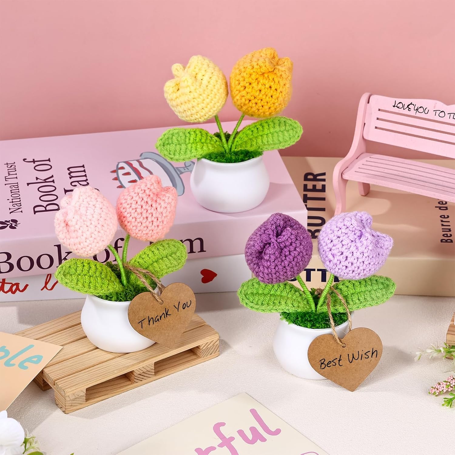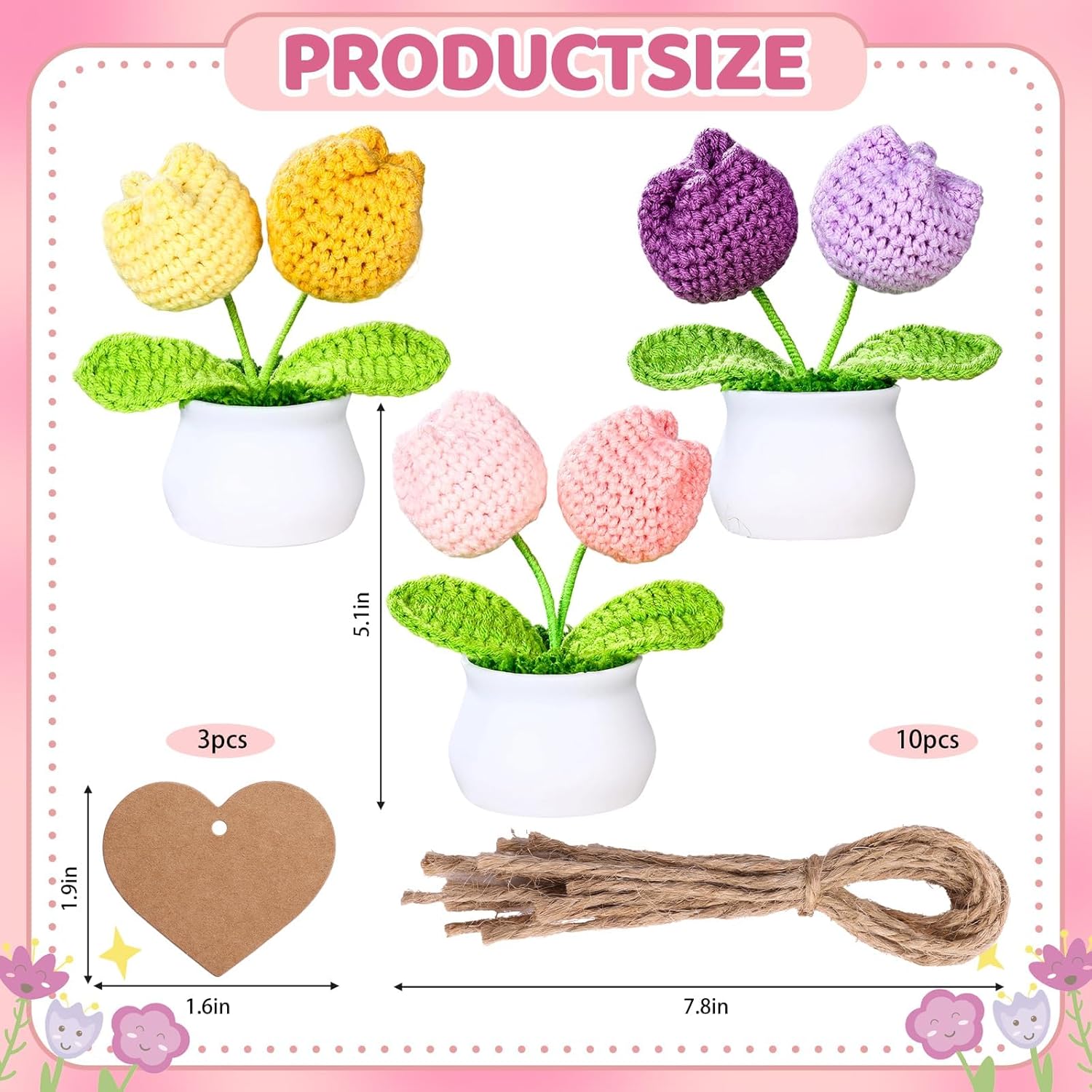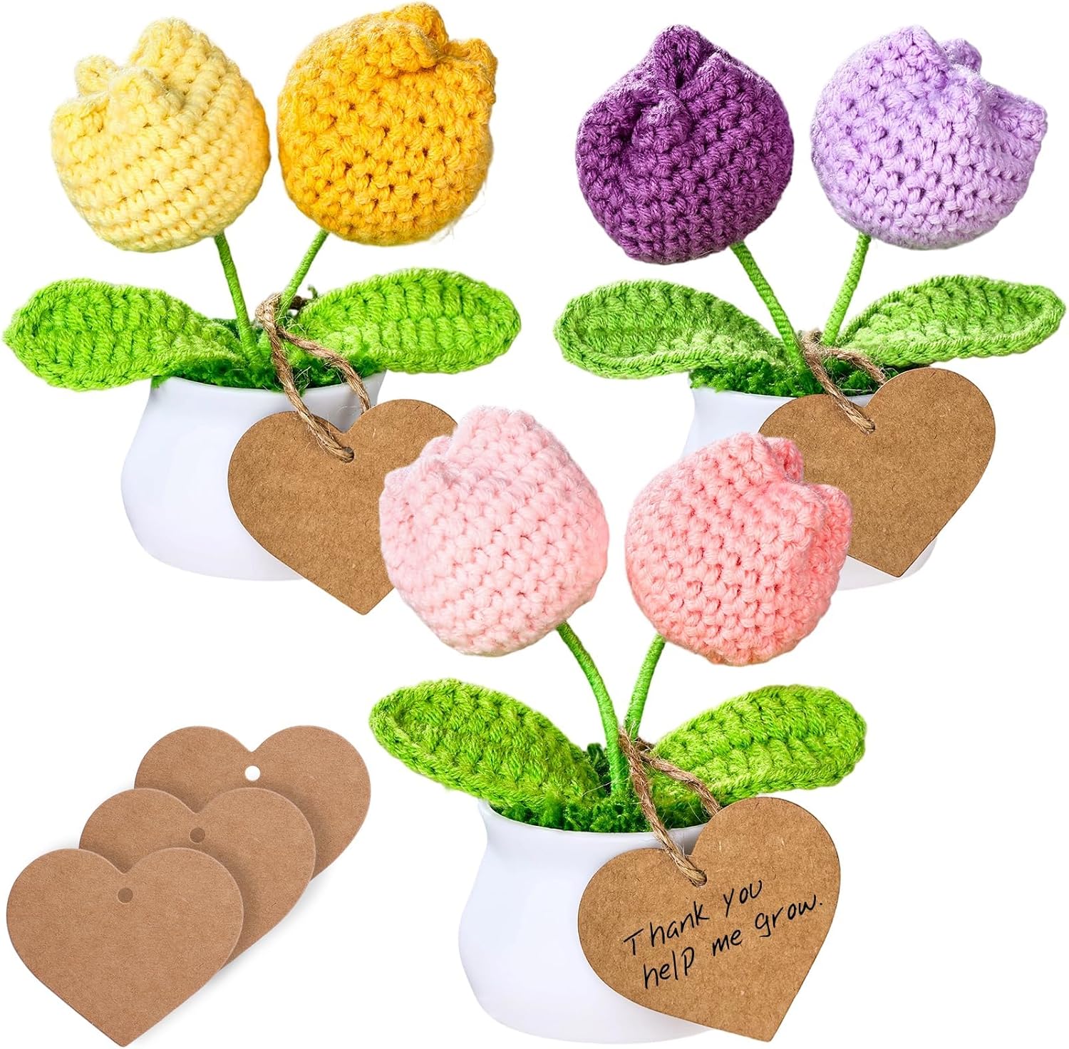 Complete Gift Ready Set:Includes 3 charming crochet flower pots, 3 heart-shaped paper cards, and 1 rustic jute twine for tying. Ideal as a crochet flower bouquet or plush bouquet for birthdays, Mother’s Day, or teacher’s Day,Valentine gifts