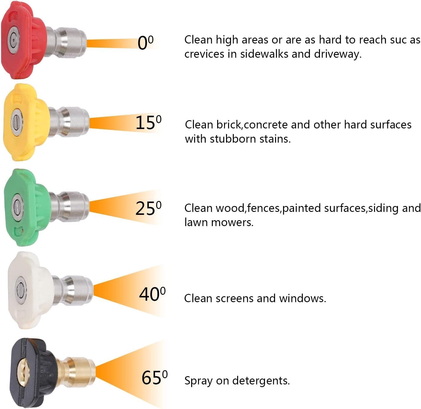 5 high quality nozzle tips for many different uses. Soap nozzle and 40, 25, 15 and 0 degree water nozzles. This variety of sizes can be used for any and all cleaning jobs!