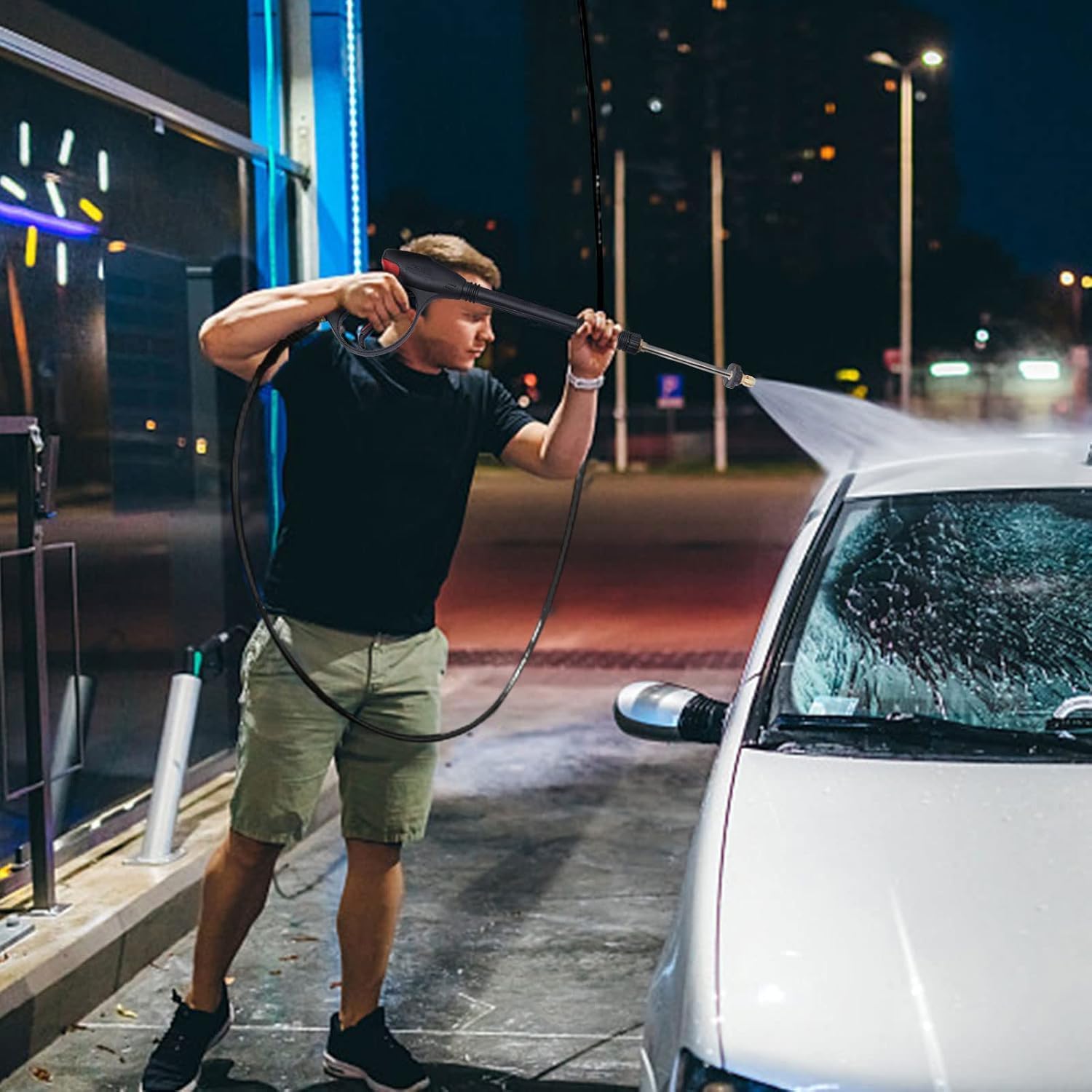 Please note that this product needs to be connected to a pressure car washer (not included) in order to work. And most importantly, the gun-barrel pressure should not exceed 3000psi.Never point the gun at anyone or pets when using the pressure washer, and never let children play around it when using the pressure washer. After turning off the pressure washer, be sure to release any pressure by squeezing the gun trigger before disconnecting the hose and nozzle.It is strictly forbidden to use the pressure washer without water, and if the water stops during use, please turn off the machine immediately, otherwise, it will affect the service life and even damage the machine.Please ensure that the water source is clean. Please do not use acid and alkali liquids, and do not use this item for spraying pesticides.