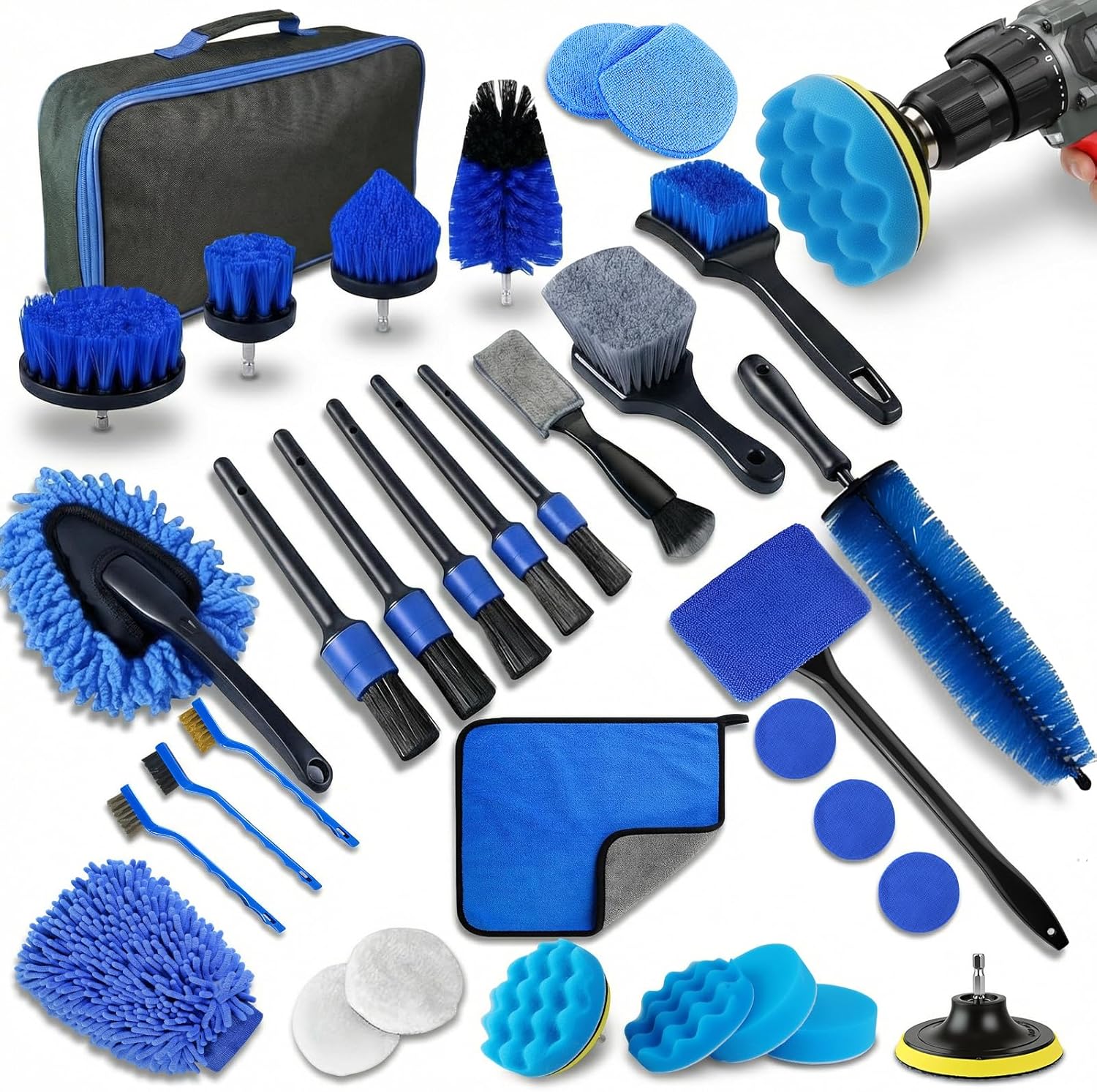 32-Piece Pro Car Detailing Kit:This all-in-one car cleaning kit includes 4 drill brush attachments, 5 detailing brushes, 3 wire brushes (steel, brass & nylon), dash duster, vent brush, wheel & tire brushes, polishing pads, microfiber towels and a storage tool bag – everything you need in one set.