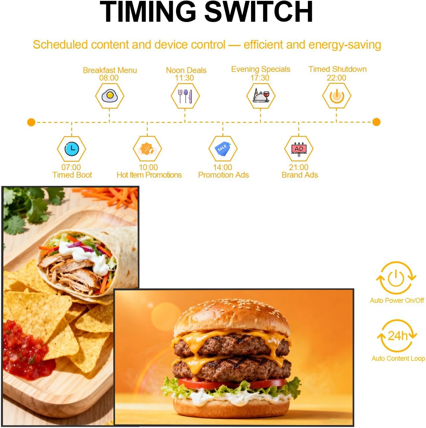 [Designed for 24/7 Commercial Operation] Built for continuous use, this signage runs smoothly around the clock. The smart scheduling system automatically switches menus, adjusts power, brightness, and volume, and follows your preset routines. With an advanced cooling system and a lifespan rated at over 50,000 hours, this display is engineered for long-term reliability and efficiency.