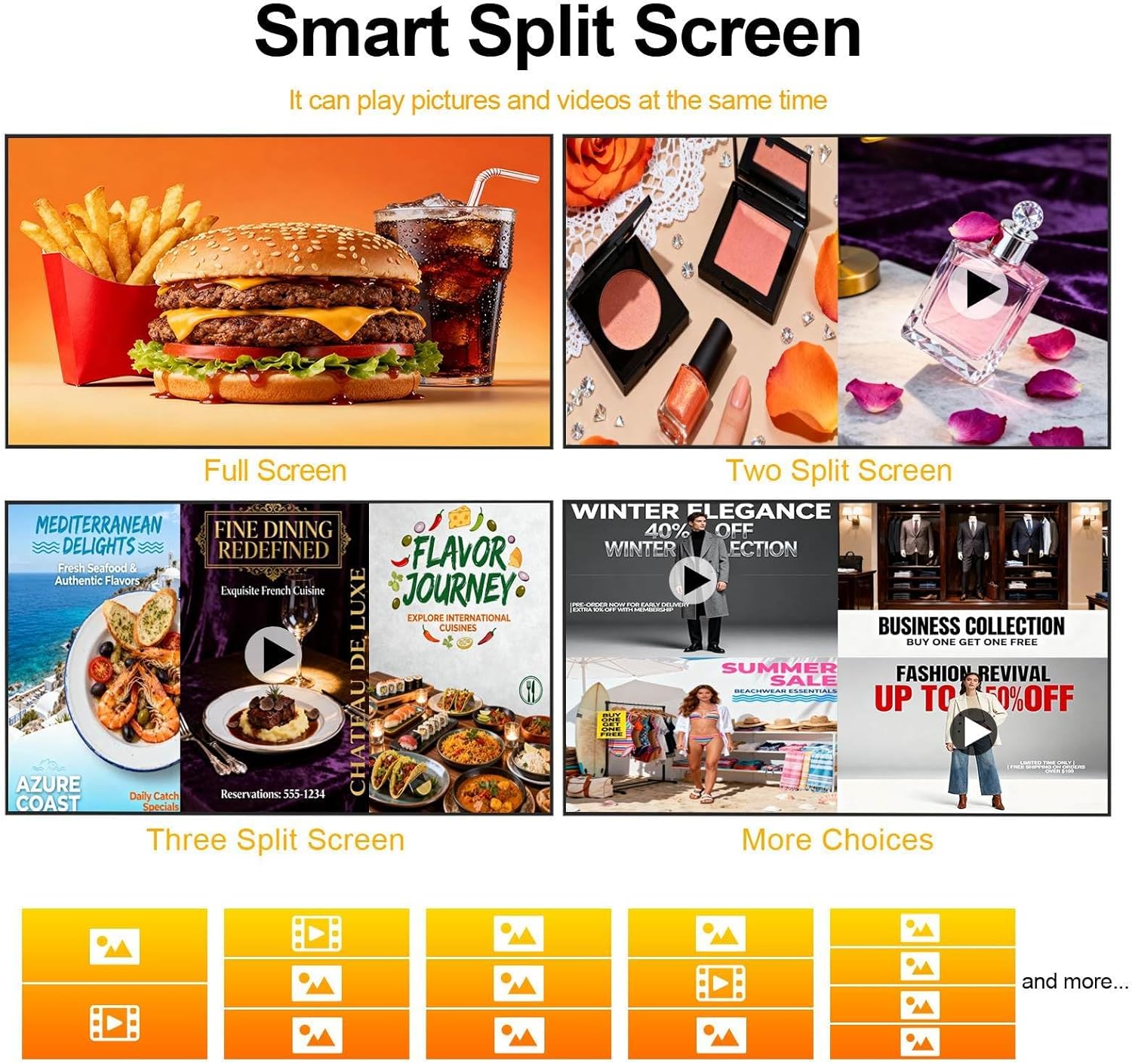 [Smart Split-Screen Display] The digital signage enhance engagement with intelligent split-screen playback. Show videos, images, and text simultaneously to create dynamic, eye-catching layouts that deliver your message more effectively. Perfect for high-impact advertising or multi-content presentations.