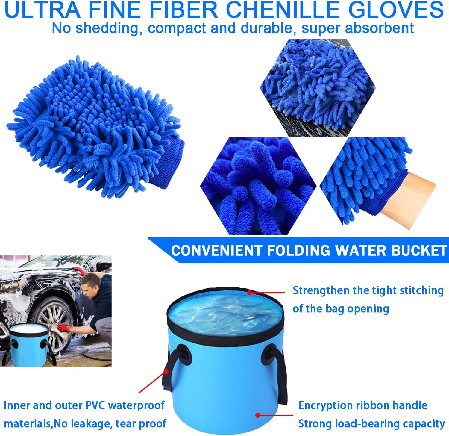 Car Cleaning Tools:This car wash kit comes with almost everything you need to wash and clean your car. Folding buckets are very popular and can be used for both indoor cleaning and outdoor use,we have included 5 different types of brushes that will allow you to better clean your car in different locations or situations!
