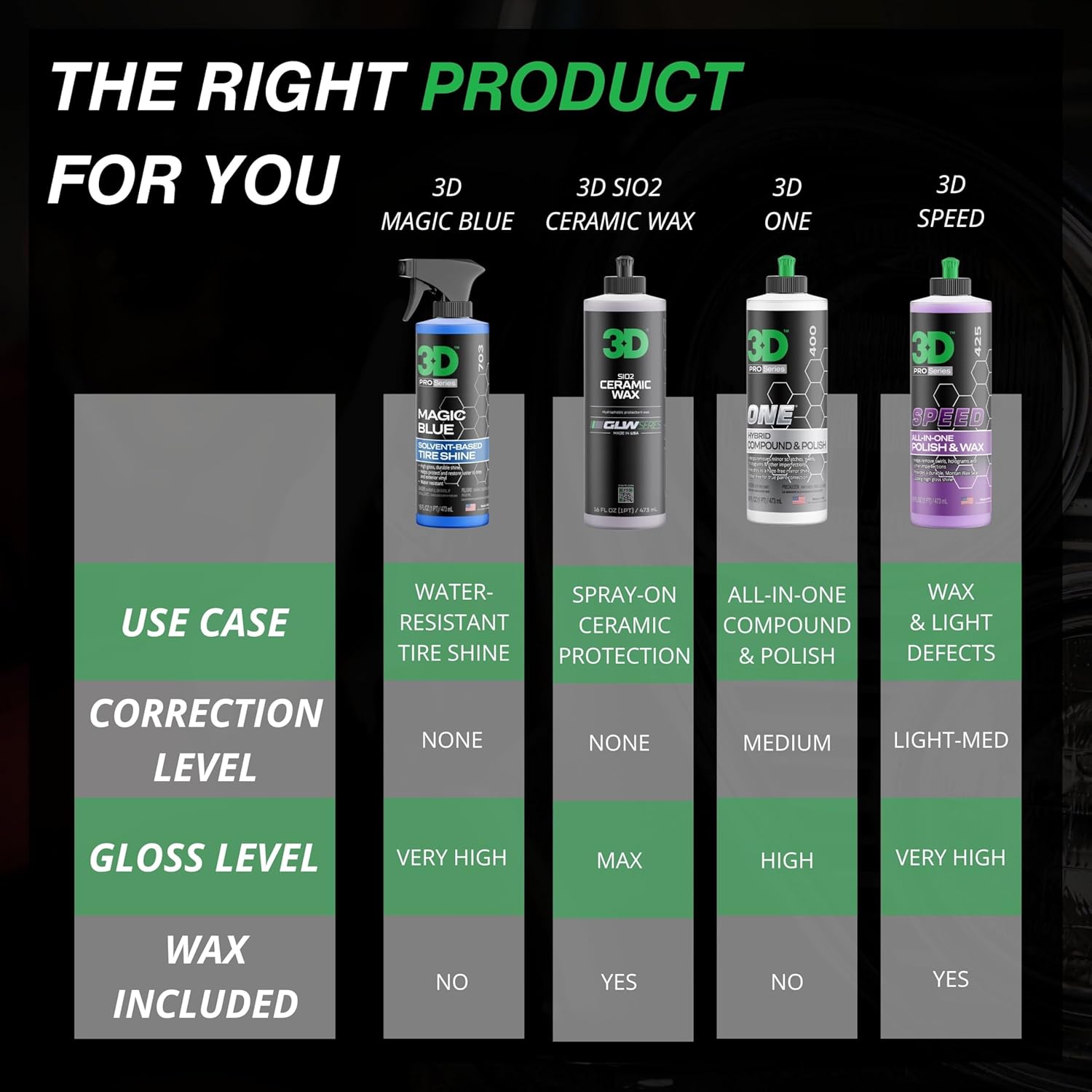 Water Repellant Rain Ready Protection: 3D Magic Blue is a solvent-based tire shine that repels water and road spray. Perfect for wet conditions, this high-gloss formula clings to rubber and plastic, giving your tires a deep, black shine that stays put, rain or shine
