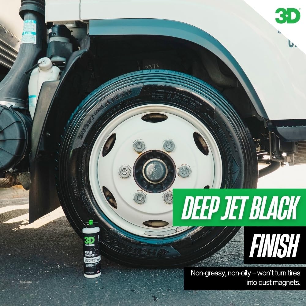 Non Greasy Dust Free Formula: Forget sticky, oily tire shines that attract dust like a magnet. 3D Tire Shine dries to the touch and won’t turn your tires into grime traps. It leaves behind a rich finish that lasts and repels dirt for easier maintenance