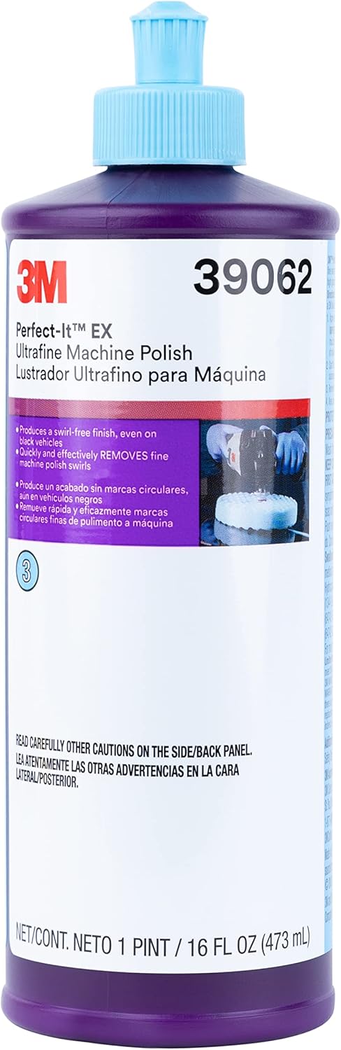 39062 3M ULTRAFINE MACHINE POLISH 16 OZ: As the final step of a truly professional vehicle paint finish, Perfect-It EX Ultrafine Machine Polish quickly and completely removes ultrafine machine polish swirls even on the most difficult black or dark-colored vehicles. Stays wet longer, using less material for a refined finish. Holds better on the pad for reduced sling and faster cleanup. You get polished surfaces without machine polish swirl marks – all at lower material costs and process times.