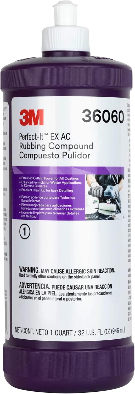 36060 3M RUBBING COMPOUND 1 QUART: This fast-cutting, fine-finishing compound removes fine grade (P1200 or finer) sand scratches and small surface defects on automotive painted surfaces. The compound works especially well on newer, harder-to-buff clear coat systems. Works in extreme conditions. Holds on the compounding pad, reducing the mess, waste and cleanup time associated with sling.