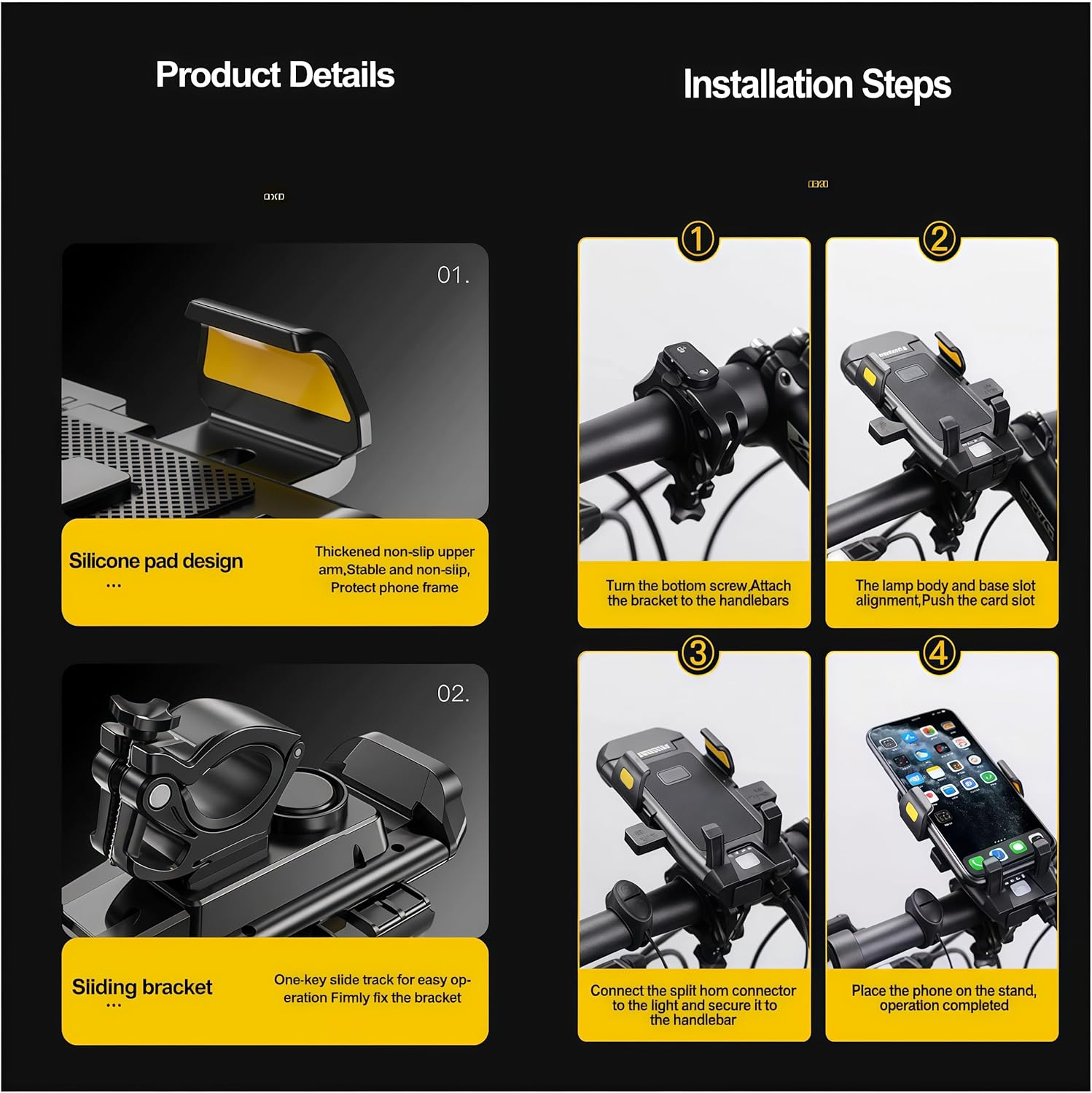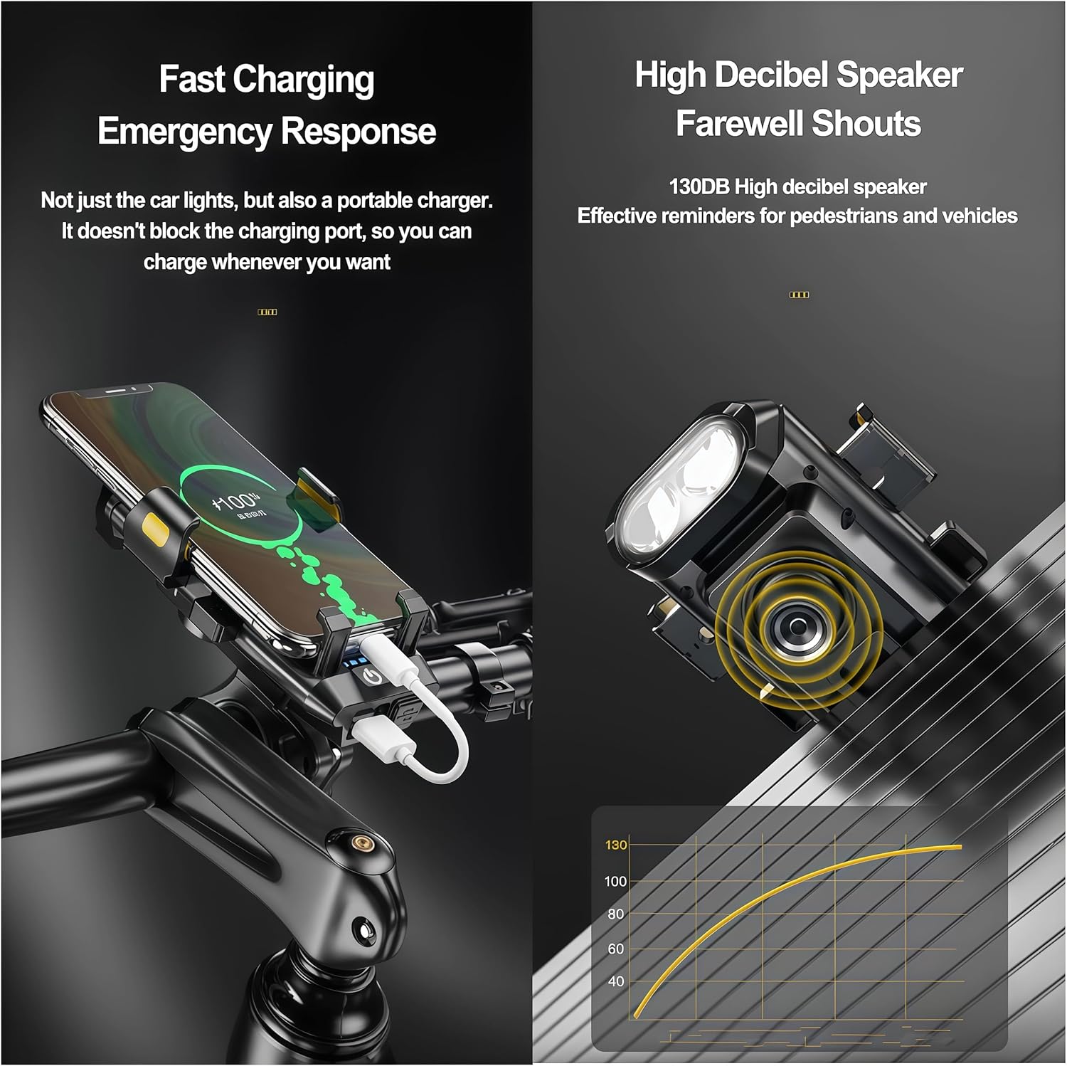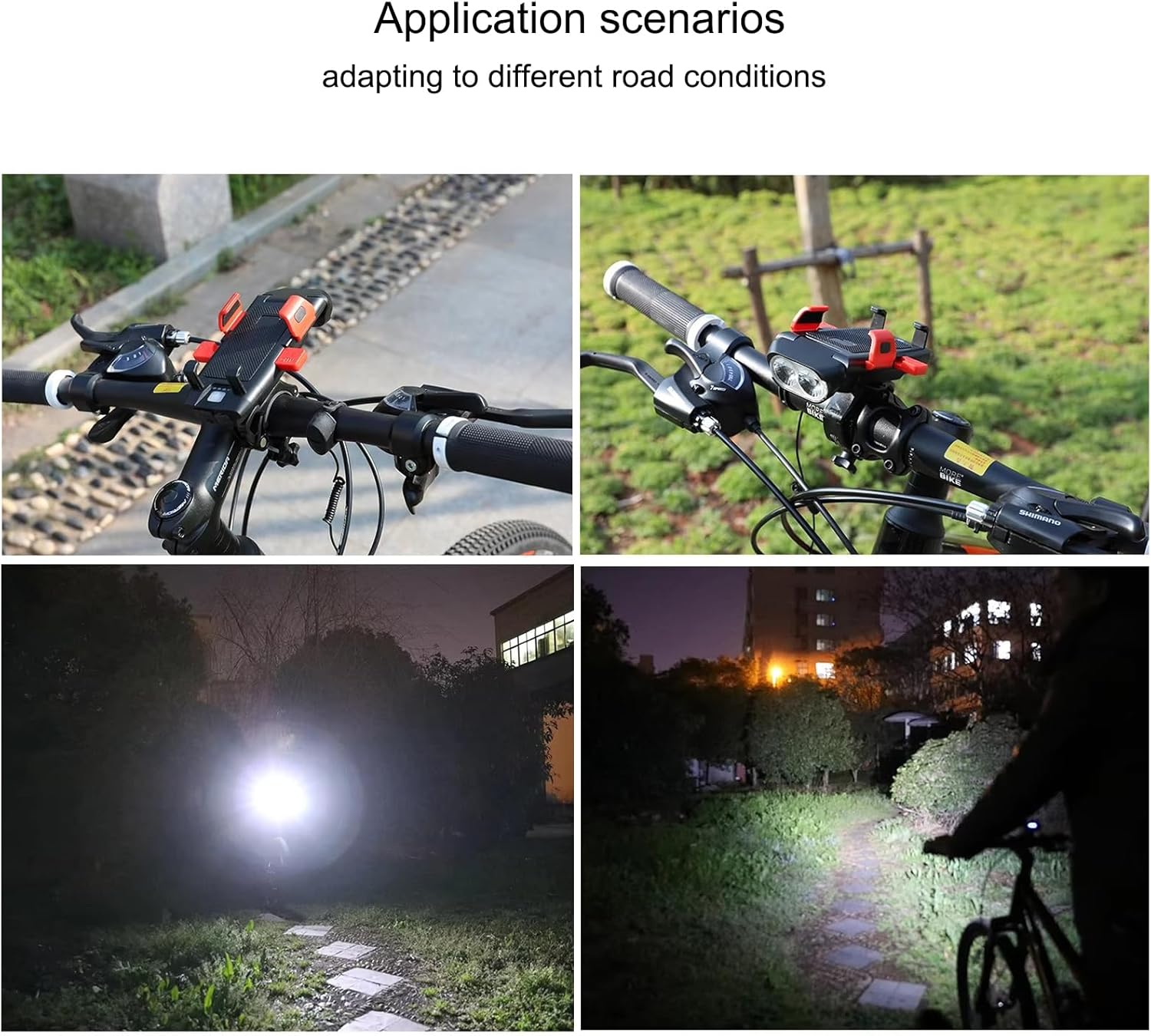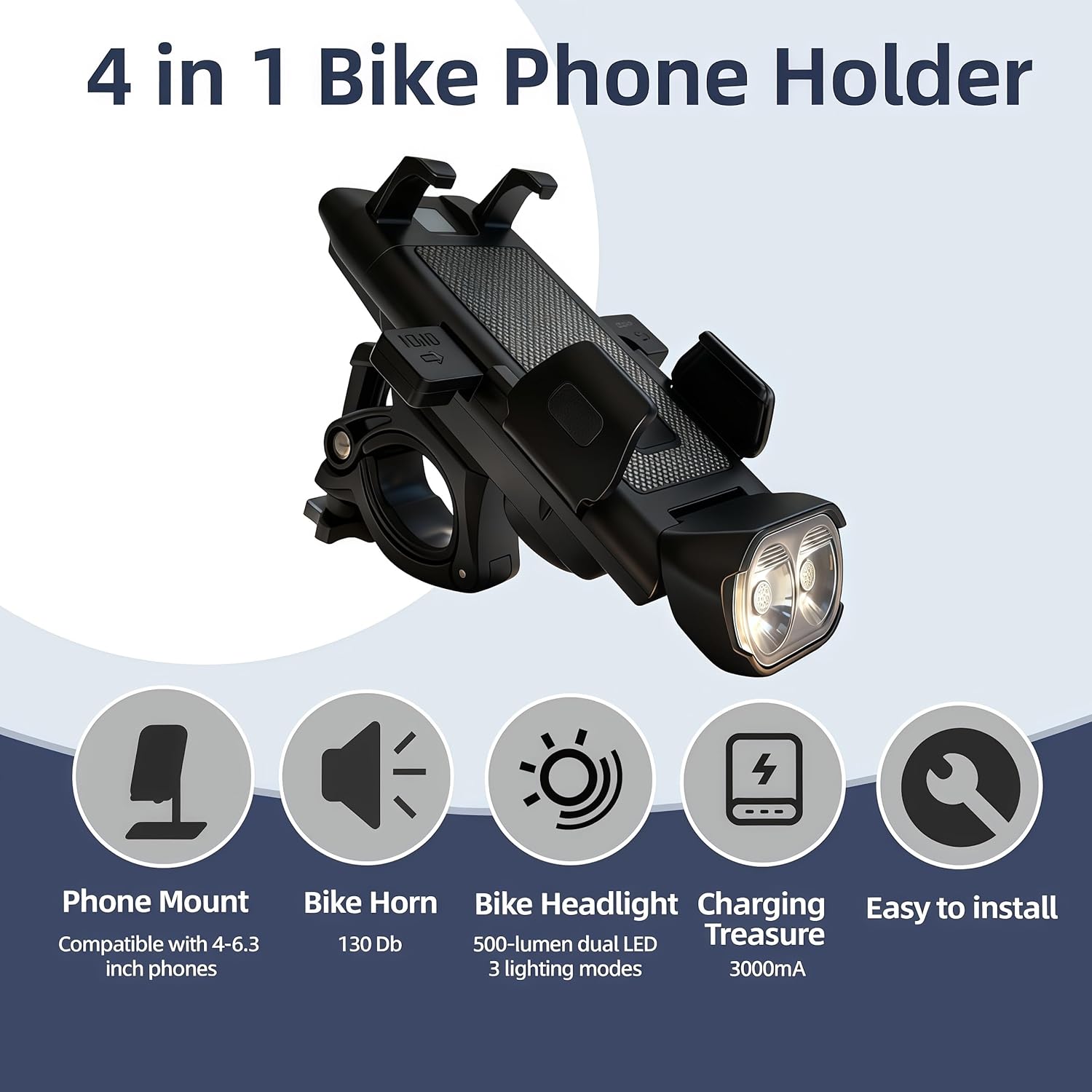 🛡️【4-in-1 All-in-One Safety Design】Bike phone mount with light, horn, and charger – all in one! Features 500-lumen dual LED headlight, 130dB horn, and 3000mAh USB charging port. The ultimate companion for night riding safety and convenience.
