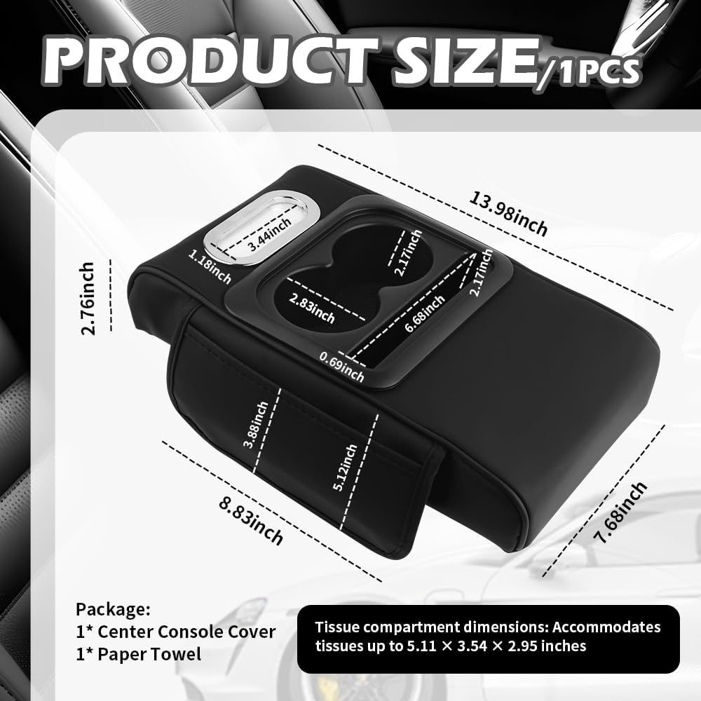 Important Size Note: This car console cover overall size: 13.98×7.68×2.76 in, side pockets: 8.83×5.12 in, cup holder diameter x depth: 2.83×2.17 in, organizer slots length: 6.68 in, width 0.69 in, depth 2.17 in, paper towel slots hold up to: 5.11 x 3.54 x 2.95 in paper towel