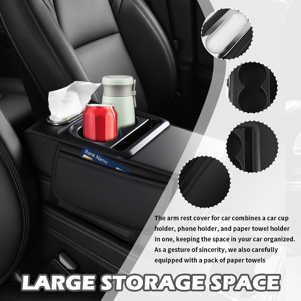 4 in 1 Center Console Cover,Multifunctional Car Armrest Storage Box with Cup Holder& Phone Holder& Car Tissue Holder,7.68 * 13.98″ Arm Rest Cover for Cars with 2 Side Pockets