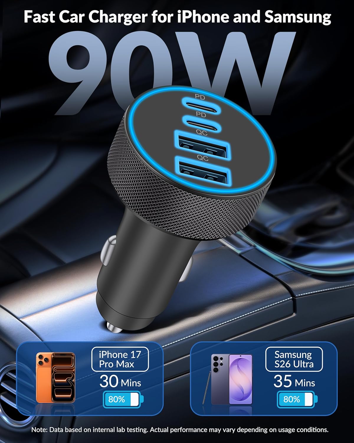 90W Fast Charging: USB C car charger adapter with all-new upgrade PD/QC super fast charging technology of 90W can charge for iPhone 17/17e/16/15/14/13/12 series up to 80% and iPad series up to 60% in 30 minutes. And also support PPS/PD super fast charge for Samsung Galaxy S26/S25/S24/S23 series up to 80% and most Android devices up to 70% in 35 minutes