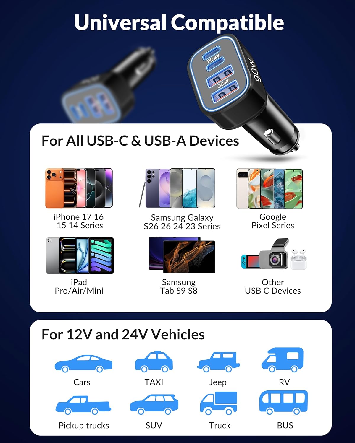 90W Super Fast Charging: The cigarette lighter adapter total output 90W, can be used with DC12-24V and the single port has a maximum power output of up to 45W (requires the car phone charger output voltage to be 24V). It can charge 70% for iPhone 17 16 15 series and 75% for Samsung Galaxy S26 S25 S24 series in 30 minutes, also provide fast charging for your MacBook/Laptop