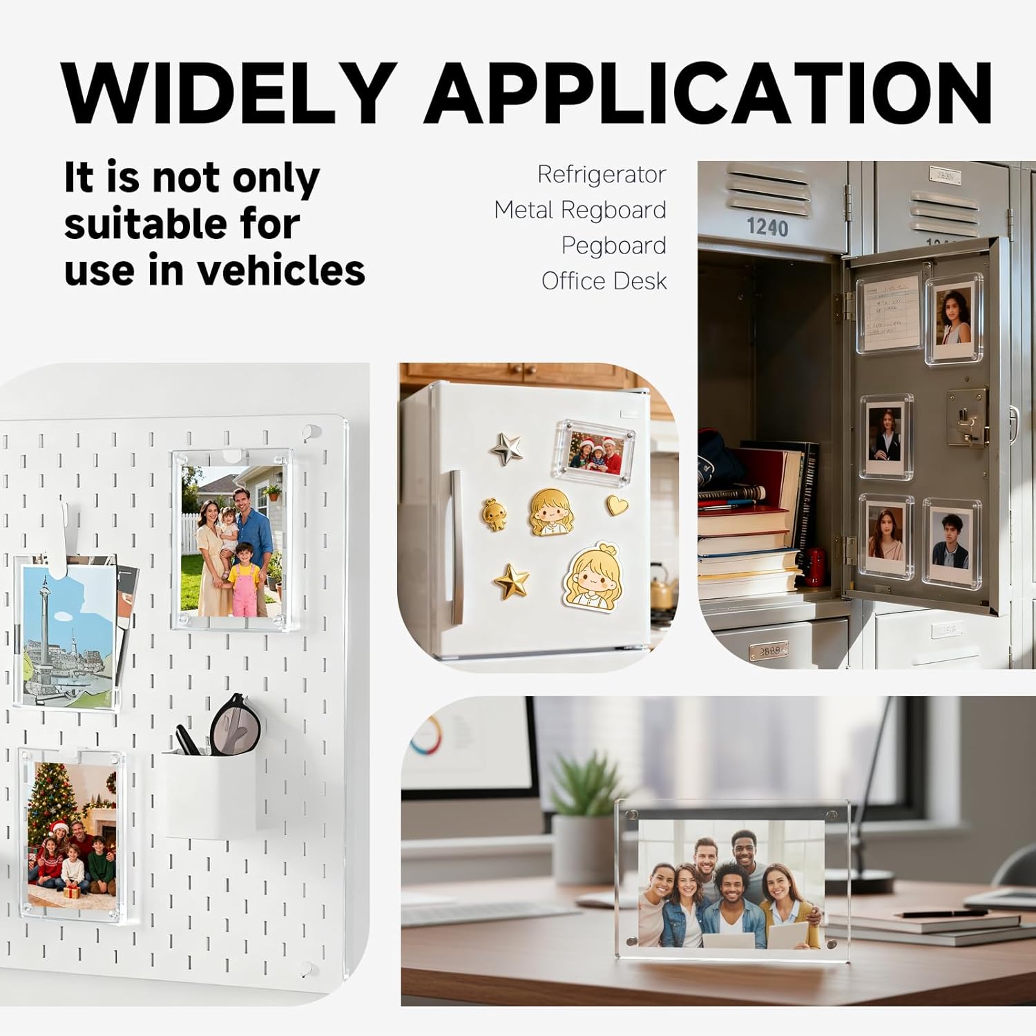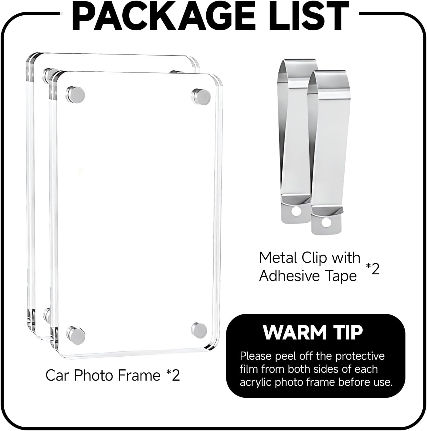 The car visor clip is made of acrylic with magnetic,which stick together with the 4 magnets at the corners, easy to change the photos.Two ways to display: Whether you prefer a horizontal or vertical display, this clip offers the flexibility to position your photo exactly as you want, giving you full control over how it’s shown”Ideal for gift: The car picture clip is best idel for giving your famil,friend or lover as a small gift and also as a cute decoration to your car.Multiple usage:They can be used on the fridge, the magnets are really strong and stick to the fridge really well. Or you can attach the visor clip for your car, adds more character to your .carTip: This photo holder comes with protective film on both sides to avoid scratches during shipping, ensuring it stays clear and ready for use once the film is removed.What you will get?The car photo holder*2, clip with adhesive*2.