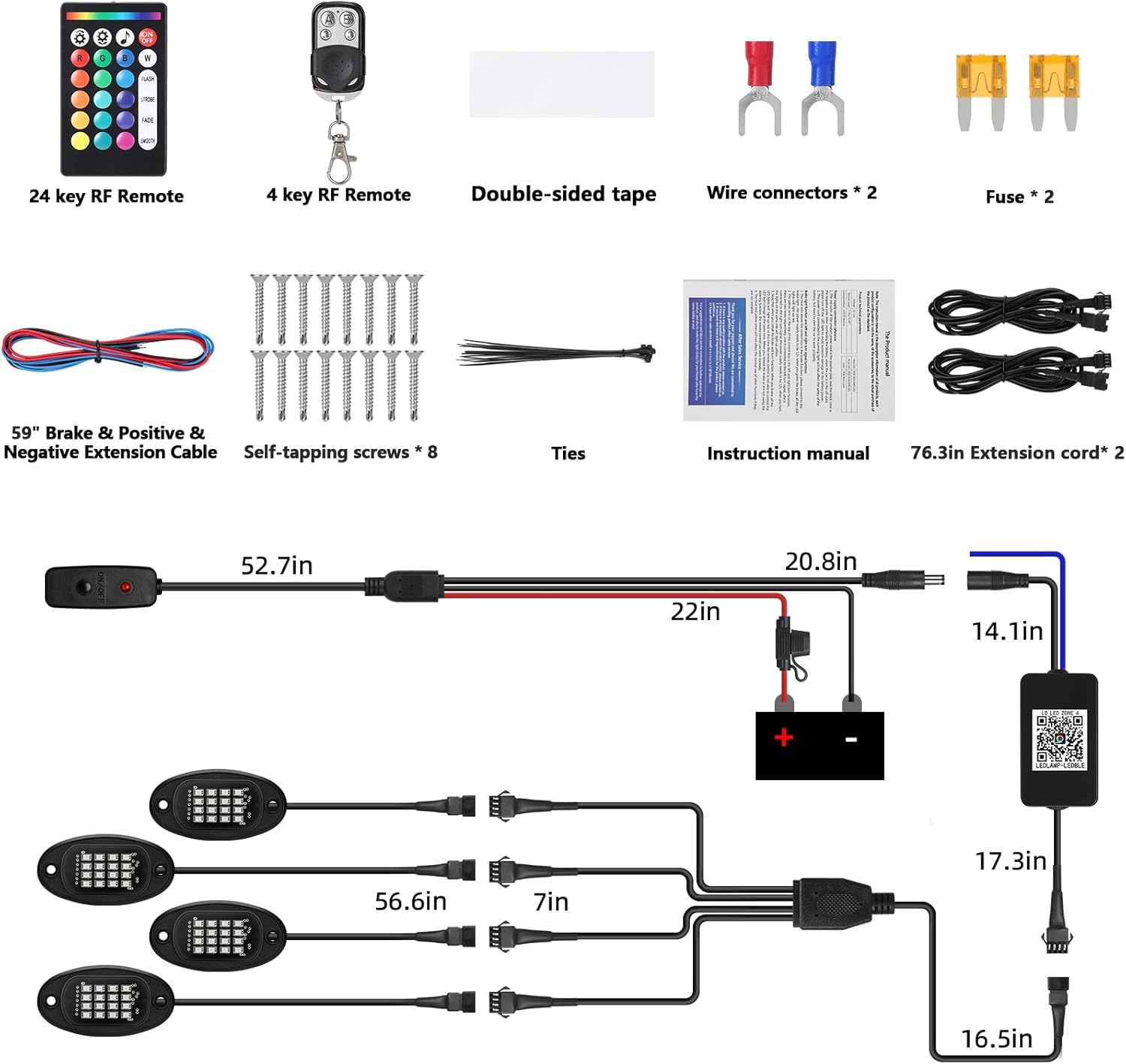 BLUETOOTH APP AND DUAL RF REMOTE CONTROL: Equipped with Bluetooth APP control, 24 key remote, 4 key keychain remote. These can turn on and off lights, adjust the speed, brightness, flashing, breathing effect, color switching, red brake, ect functions of the lights. The APP with music sync, voice control, dimming brightness, timing setting, millions of color options, customizable unique lighting effects. Compatible with iPhone and Android. Remote Range: Within 10 m or 32.8 ft