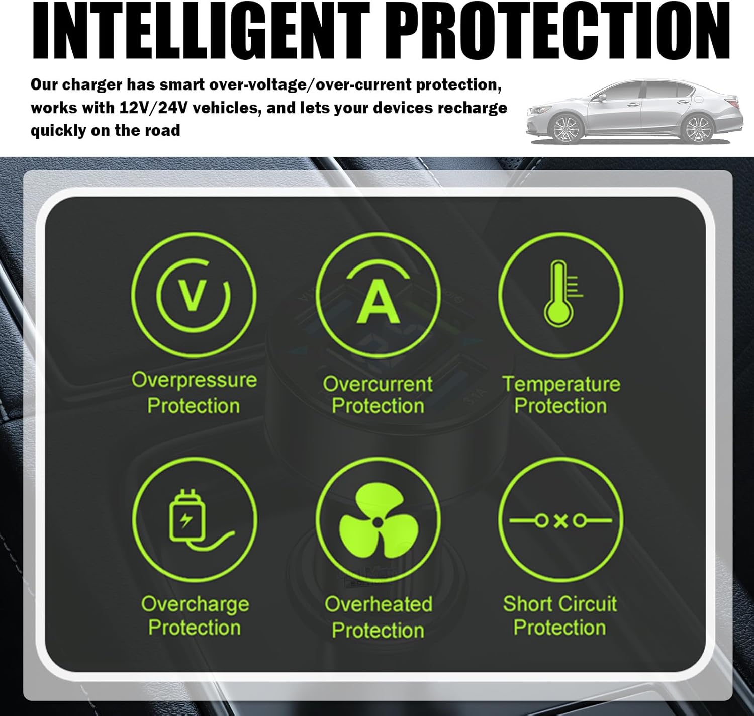 Intelligent Protection: Our car cigarette lighter charger integrated over-voltage and over-current protection, built-in intelligent chip, to avoid potential safety hazards, very suitable for 12V/24V vehicles, so that your device in the commute to and from work on the road quickly back to blood