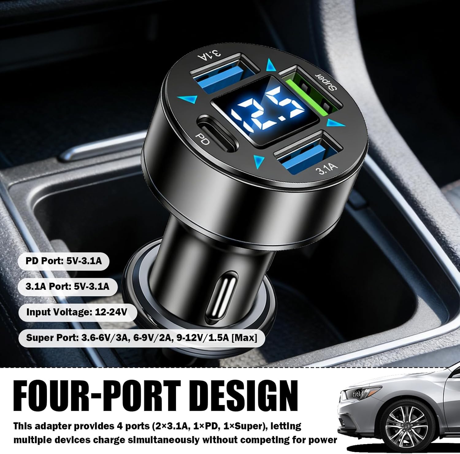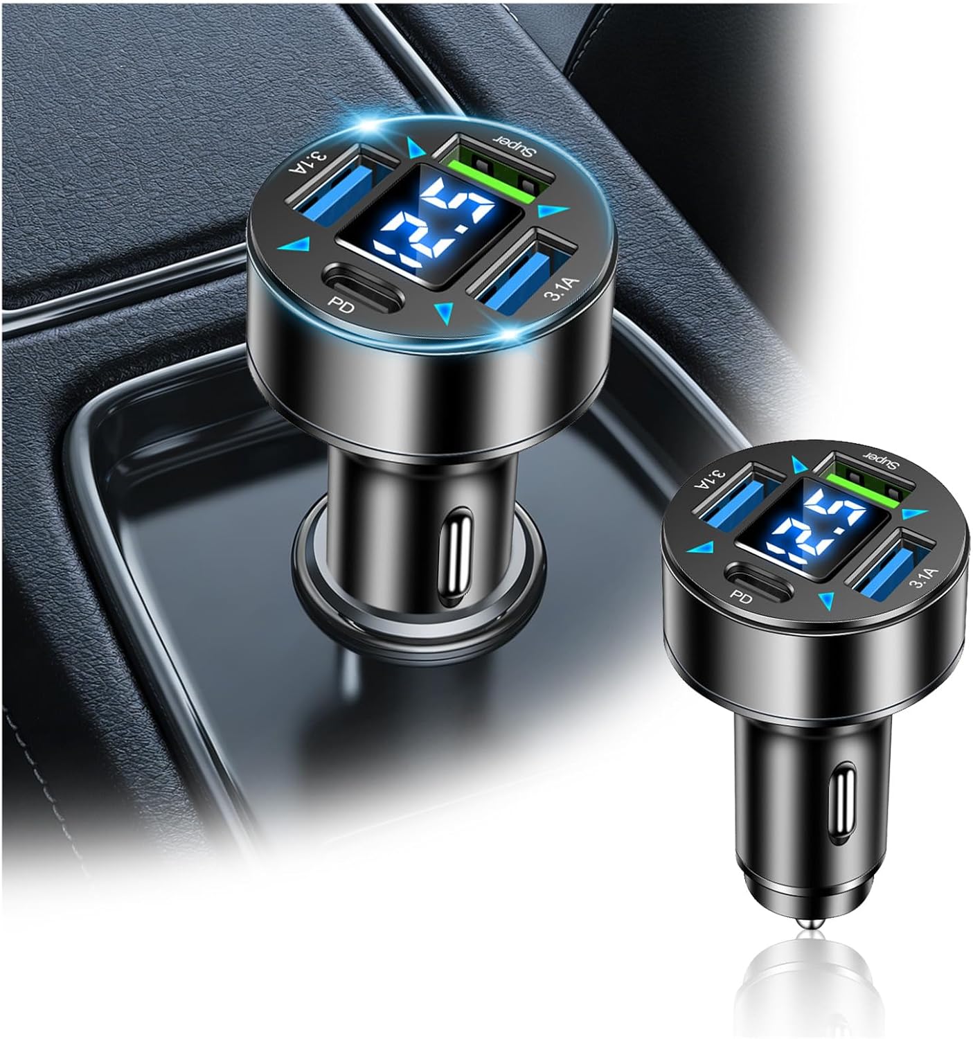 I am beyond impressed with this 4-Port Car Charger Adapter. I’ve gone through so many cheap gas station chargers that break after a week, but this one is in a league of its own. It’s powerful, sleek, and packed with features that actually make driving safer and more convenient.Why This Charger is a Game-Changer:Insane Charging Speed: With the PD (Power Delivery) and Super Fast Charging ports, my phone goes from dead to nearly full in under an hour. It handles my laptop, tablet, and smartphone all at once without breaking a sweat or slowing down.Real-Time Battery Monitoring: The LED Voltage Display is a brilliant addition. It gives me peace of mind to see my car battery’s health at a glance. It’s an early warning system for alternator issues that every driver should have.Four Ports, Zero Compromises: Most multi-port chargers weaken when you plug in a second device. This one manages the power distribution perfectly, providing a consistent, fast charge to all four devices simultaneously.Nighttime Convenience: The soft light is just right—it’s bright enough to help you find the ports in total darkness but subtle enough that it isn’t a distraction while driving.Sturdy & Universal: It fits snugly into the cigarette lighter and stays put even on bumpy roads. Plus, it works seamlessly with both my 12V sedan and my husband’s 24V truck.Final VerdictIf you have multiple devices or travel with passengers frequently, this is a 10/10 purchase. It’s high-tech, durable, and reliable. It’s more than just a charger; it’s an essential tool for your vehicle. Highly recommended!