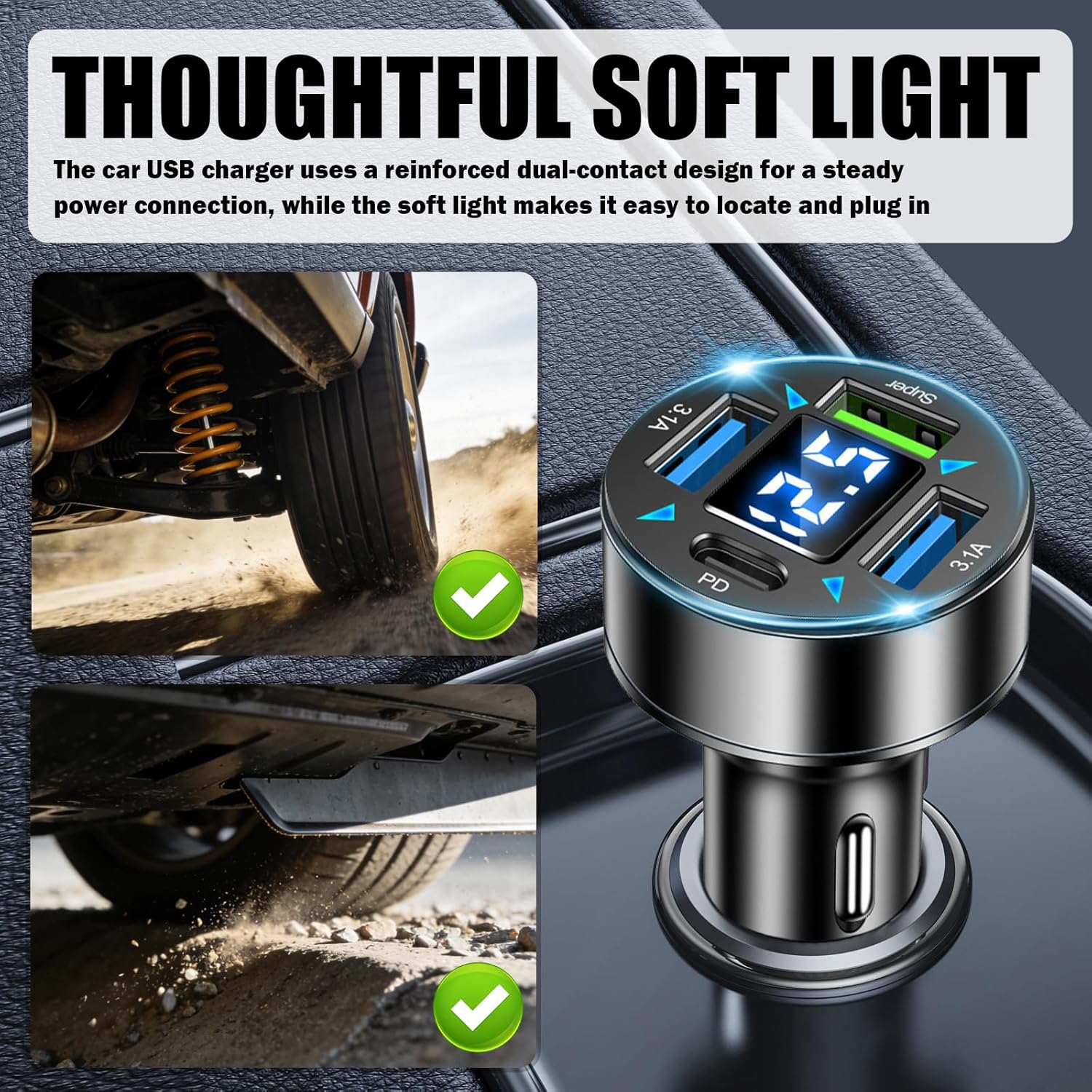 Thoughtful Soft Light: The body of the car USB charger features a reinforced dual-contact structure that provides reliable power supply and avoids accidental loosening, while the soft light design helps you easily and accurately locate and insert the charger