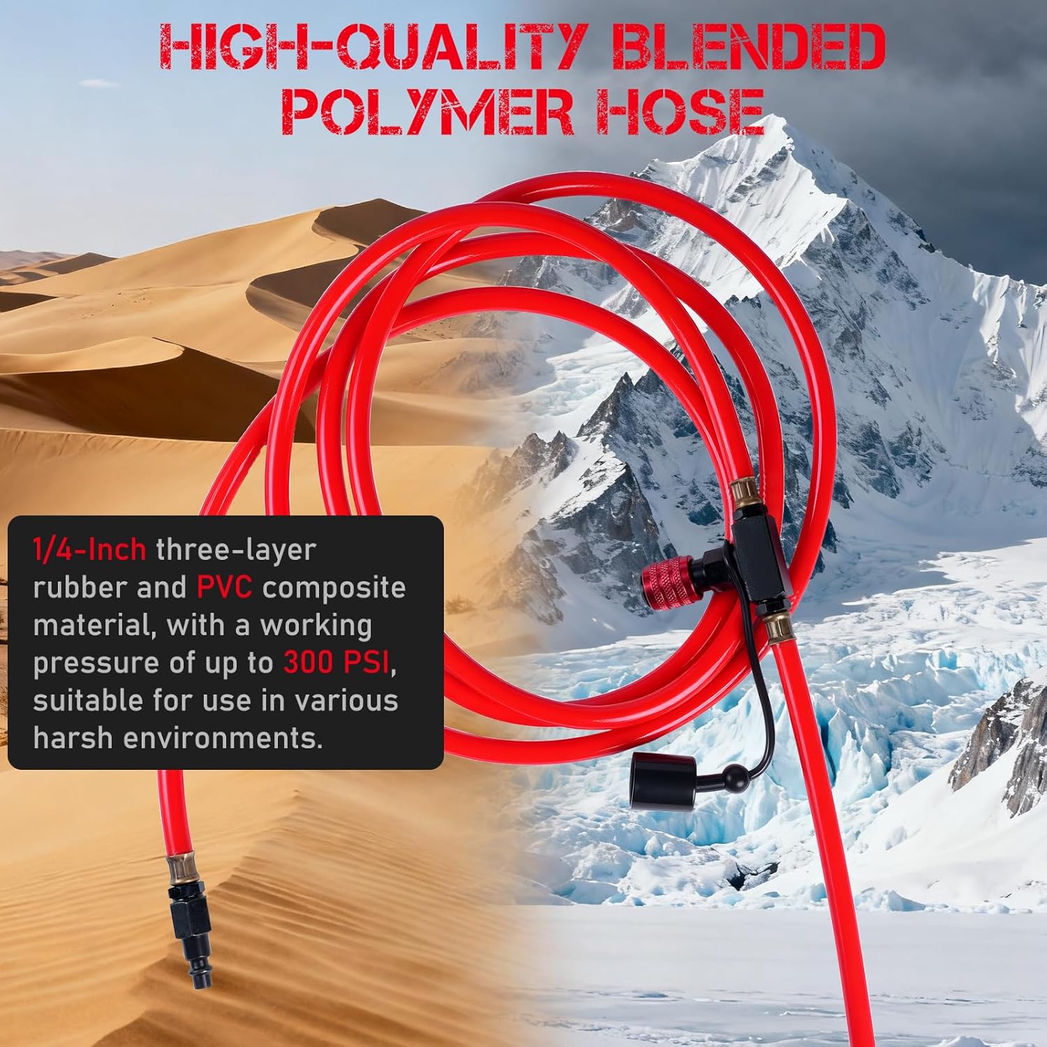 Ultra-Efficient: Say goodbye to tedious single-tire inflation rotations. The 4 Tire Inflator Hose Kit lets you inflate or deflate all four tires simultaneously, drastically cutting wait times. Whether for routine maintenance or adjustments before/after off-road adventures, it delivers twice the results with half the effort.